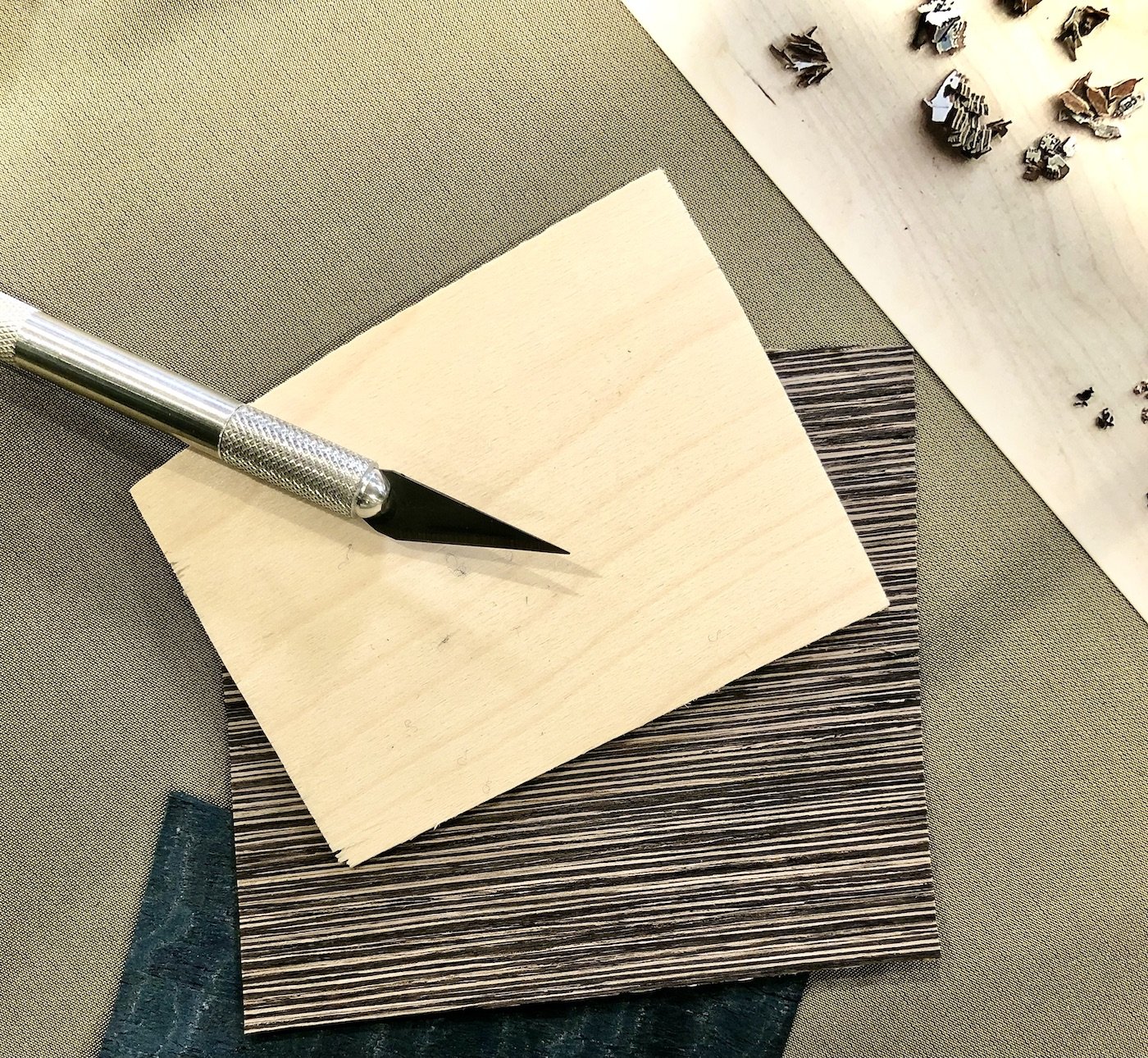 Preparatory sketch signed “jb. nov. 2015”, with a list of the wood species chosen for this jigsaw puzzle of 315 tiny pieces of veneer.