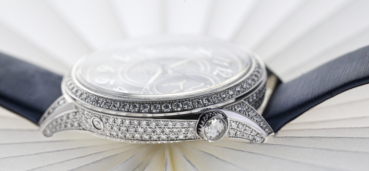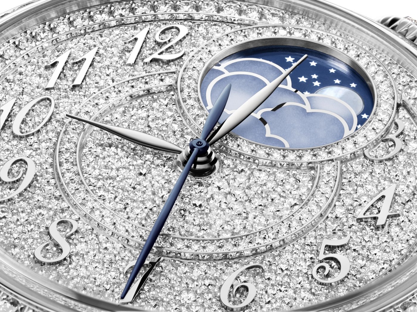 When night falls, the Égérie moon phase diamond-pavé model leads the dance in a stunning evening gown. Its case in 37 mm 18K white gold sparkles with 292 diamonds, while the dial deploys its concentric circles amid a shower of 510 diamonds resembling a precious embroidery. An Haute Couture look that brilliantly showcases the masterful touch of the Manufacture’s finest gemsetters.