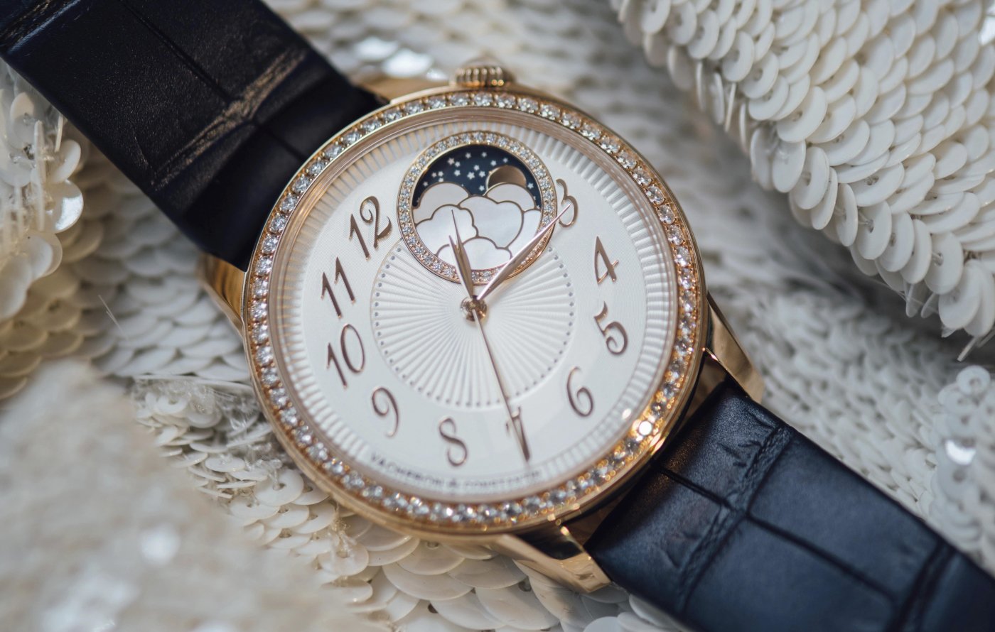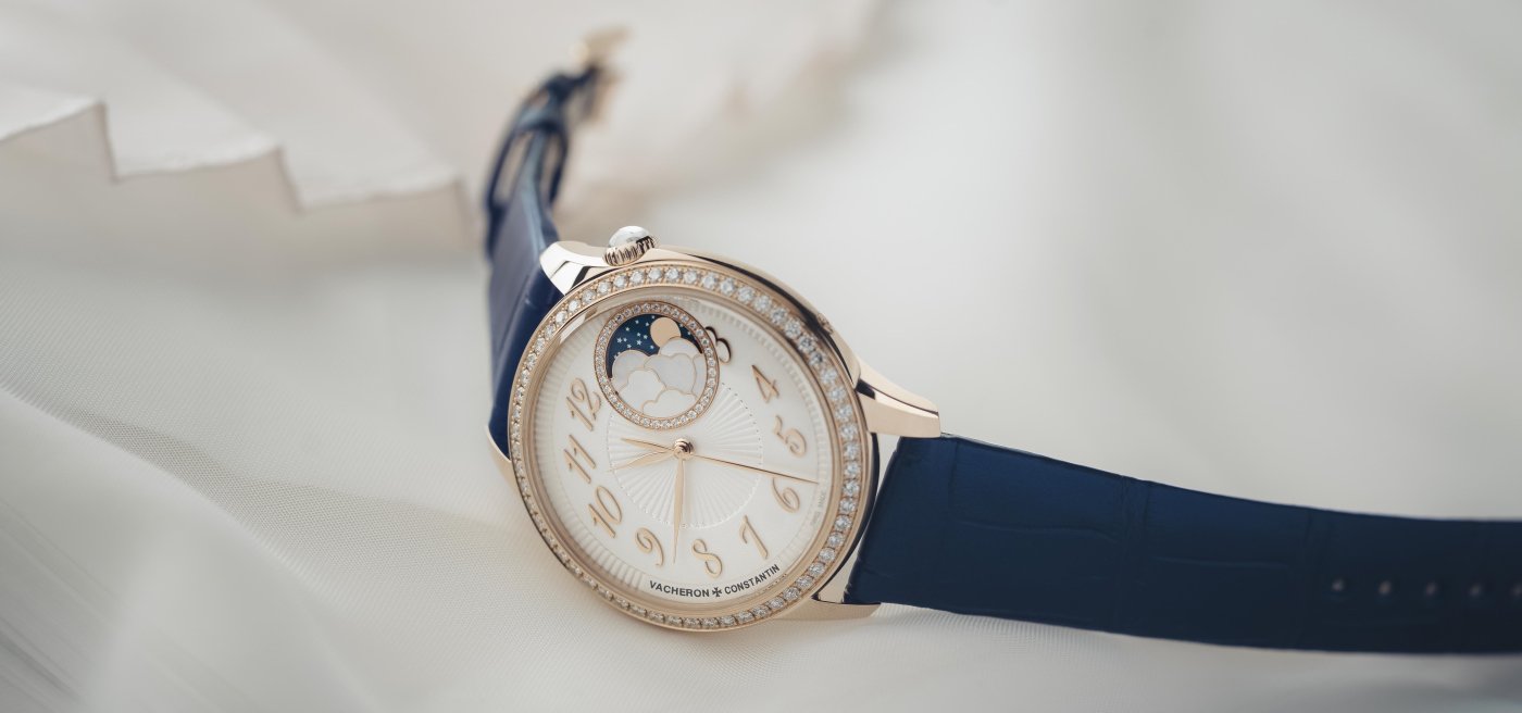 Égérie is also the modern interpretation of aesthetic codes cherished by Vacheron Constantin, which has been offering off-centre displays since the early 19th century, notably by playing on two intertwined circles. Égérie has made this its signature touch. The date or moon-phase integration is thus part of a subtle diagonal line formed by the Vacheron Constantin logo and the crown daringly taking its place between 1 and 2 o’clock. Depending on the model, the latter is adorned with a cabochon-cut moonstone or a rose-cut diamond. This creative freedom is driven by a bold spirit that makes all the difference.