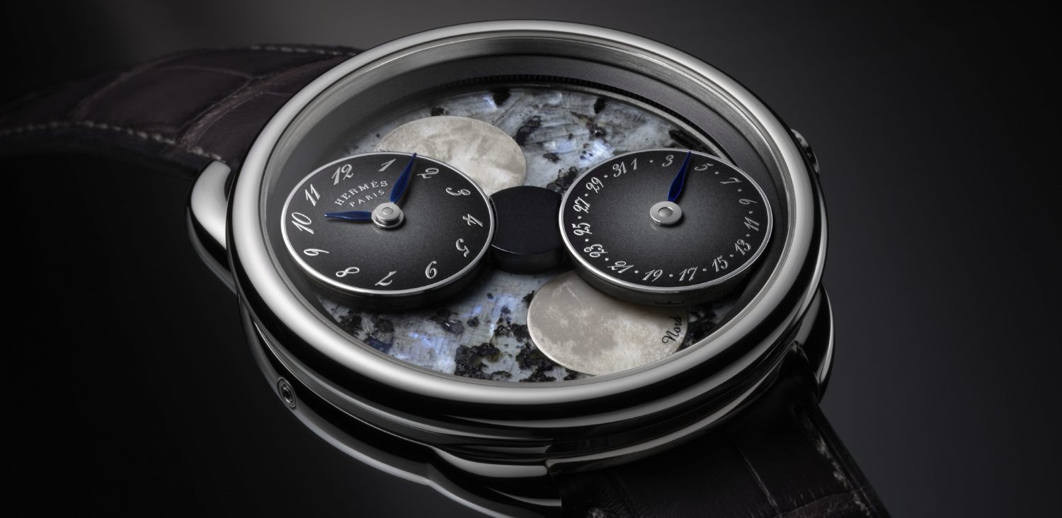 Within this space-time, metal, stars and rock seamlessly merge the watch exterior with the movement to form an unprecedented technical and aesthetic display of simple and graphic readability. The double moon here eclipses a traditional aperture-type display, instead covering the entire surface of the dial. The result is a free-spirited and impertinent vision of mechanical watchmaking according to Hermès.