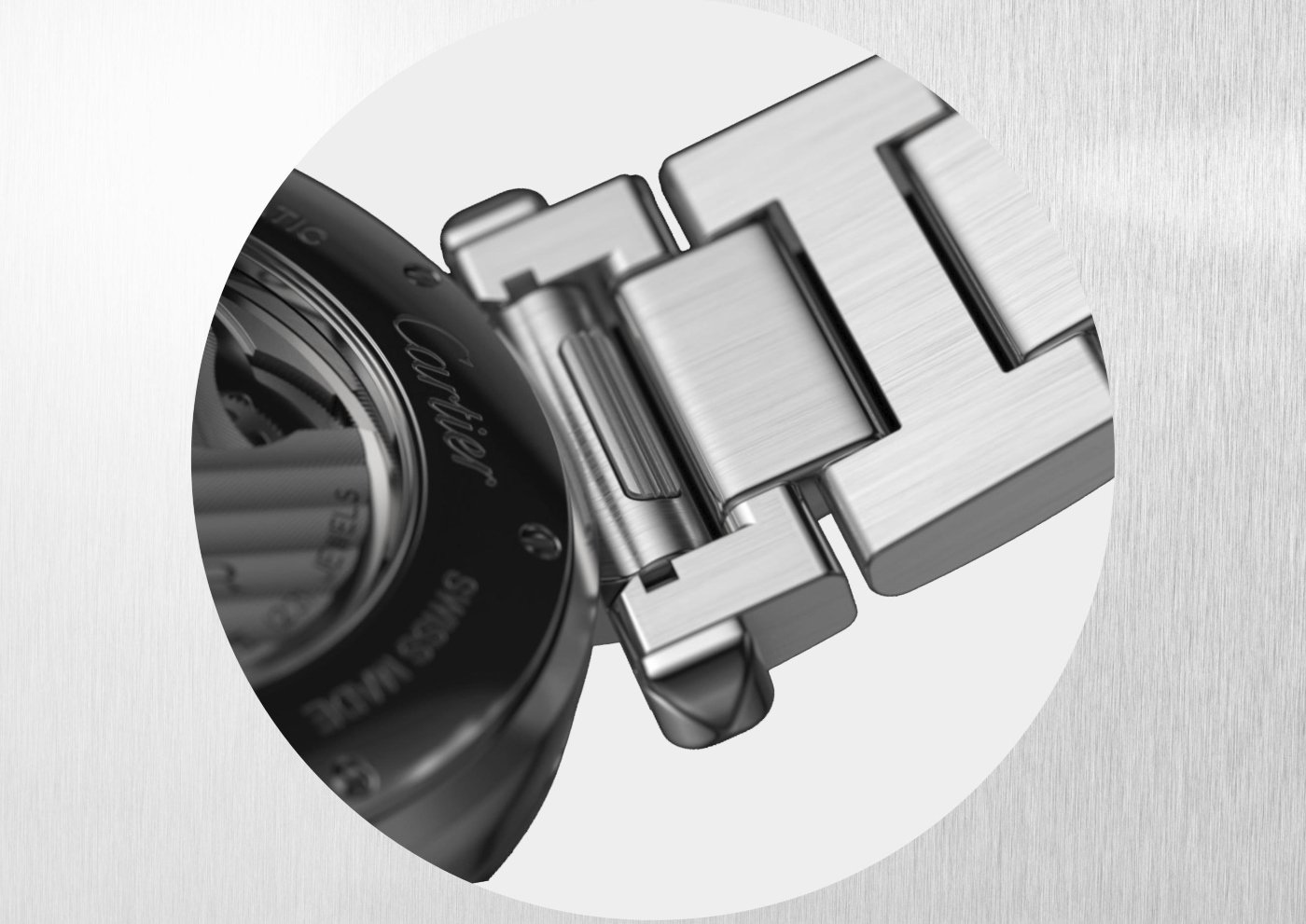 In steel, gold or leather, all versions can be interchanged thanks to an adaptation of the Cartier-developed QuickSwitch system. This invisible mechanism blends into an architecture located under the case and is activated by a single push.