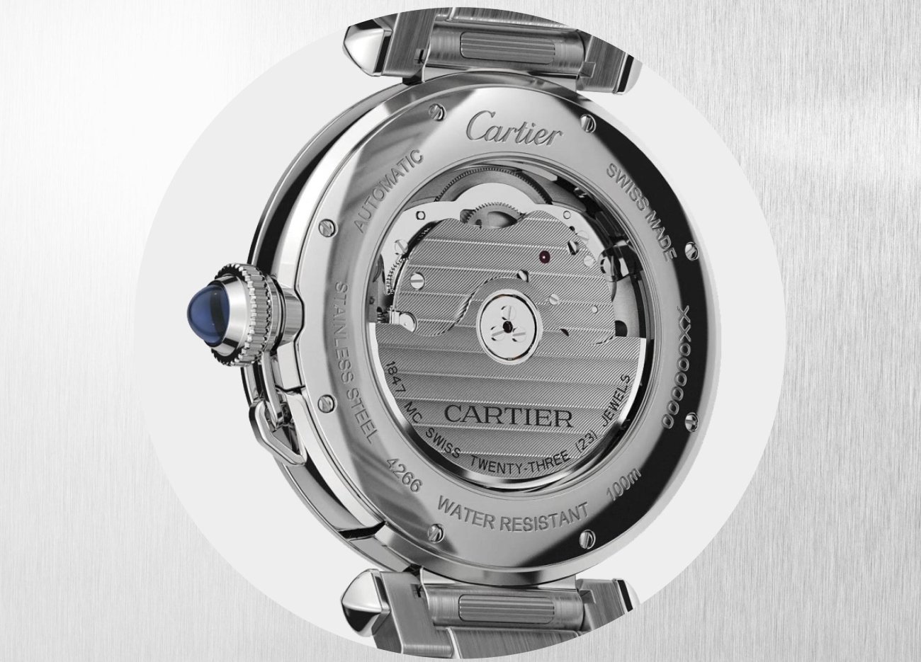 Equipped with a sapphire crystal case back that reveals its movement, the new Pasha de Cartier watch is endowed with the 1847 MC automatic calibre. This in-house movement goes further still in the quest for performance and reassurance thanks to its resistance to both magnetism and water.