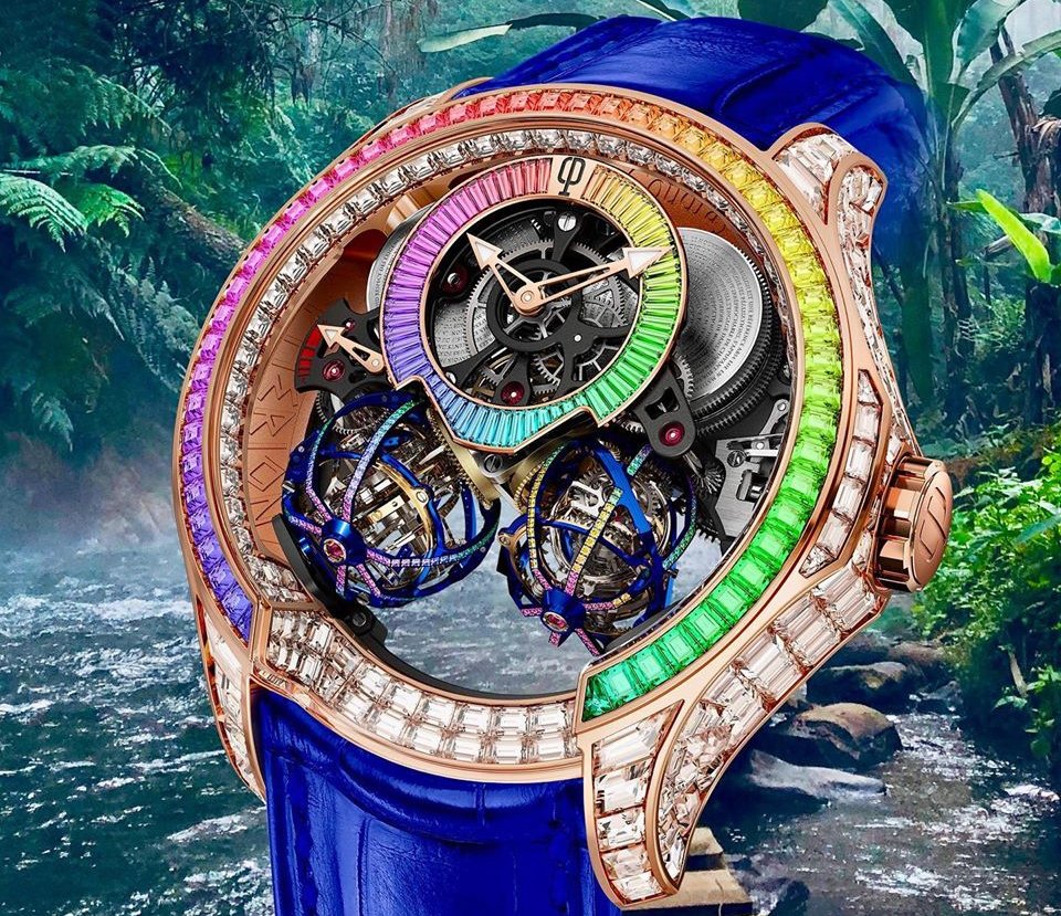 The new Escape II Treasure collection offers a choice of four new versions, each customizable upon request. Each version comes with a skeletonized movement, a 32-hour power reserve, and a 44mm case made smaller for a feminine wrist. Two versions, the Treasure Diamond and the Treasure Rainbow are set with diamonds or “rainbow” gemstones on their tourbillon cages, while two more versions also feature a case and dial fully set with baguette-cut diamonds or “rainbow” gemstones. Across this collection, the sparkle of gemstones enhances the visual spectacle of the double Spherions visible through a custom-crafted monobloc sapphire glass, setting a new standard for grand complications for women.