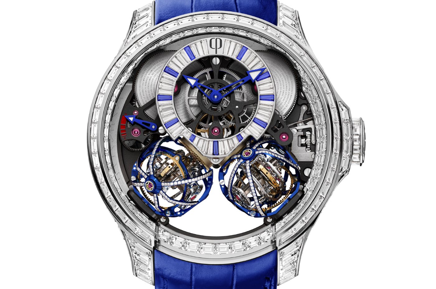 Fitting the double-Spherions into the movement required two years of development for the watchmakers to rethink the caliber construction and 386 components in their entirety. Fourteen months were required to develop the single-piece sapphire glass and side-viewing windows positioned by the lugs at 6 o’clock, to enhance the experience of full visibility onto the two high-speed Spherions.