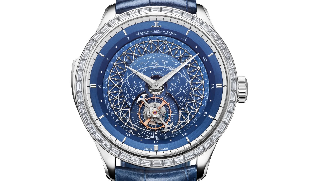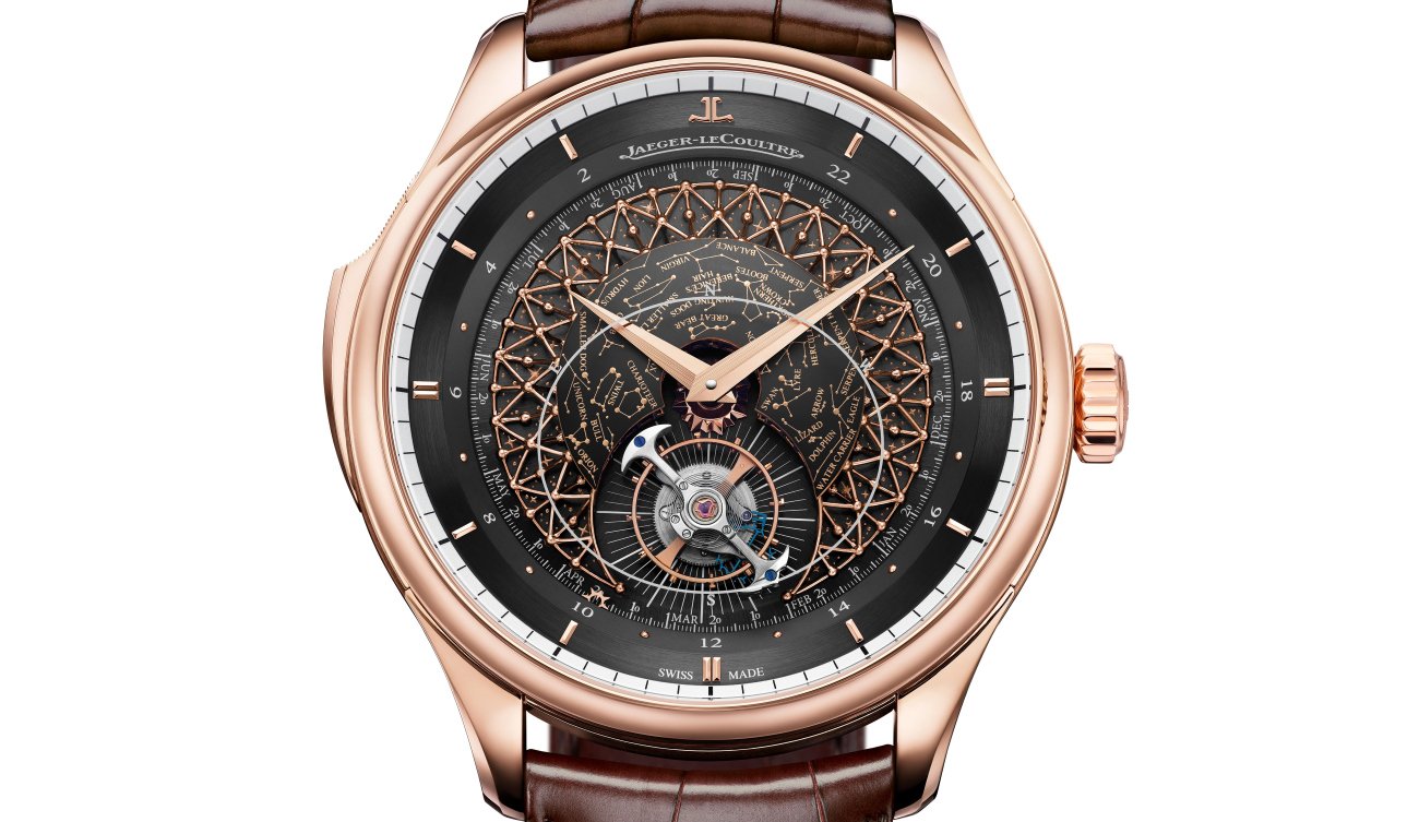 A multiple-level dial amplifies the beauty of the celestial theme while also showcasing the orbiting tourbillon. On the deepest level of the dial, a midnight blue or black disc (depending on the model) is decorated with tiny stars. Above it, a delicate filigree forms a dome, its structure echoing the pattern of the constellations marked on the convex celestial disc. The star chart depicts the Northern Hemisphere night sky, as seen from the 46th parallel – the latitude of Jaeger-LeCoultre’s home in the Vallée de Joux.