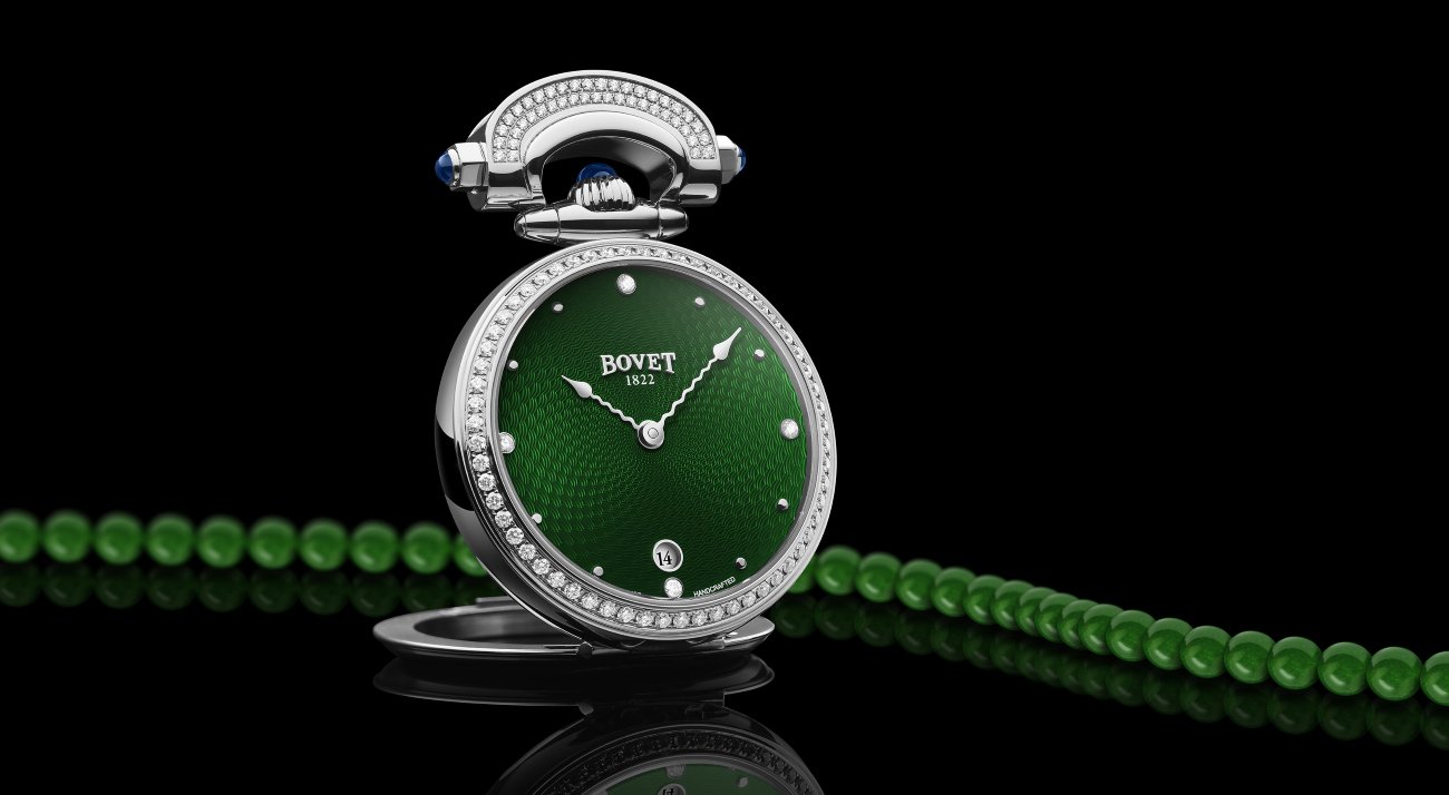The case’s convertible feature allows the timepiece to be worn on the wrist, transformed into a table clock or turned into a majestic pendant without needing to use any tools. To match the dial in perfect harmony, Mr. Raffy, BOVET 1822’s owner, has designed an original long jade bead necklace that highlights the refinement of the timepiece. Powered by an automatic movement displaying the date at 6 o’clock, Miss Audrey is a timepiece that offers the comfort of use that is rare for such a gem.