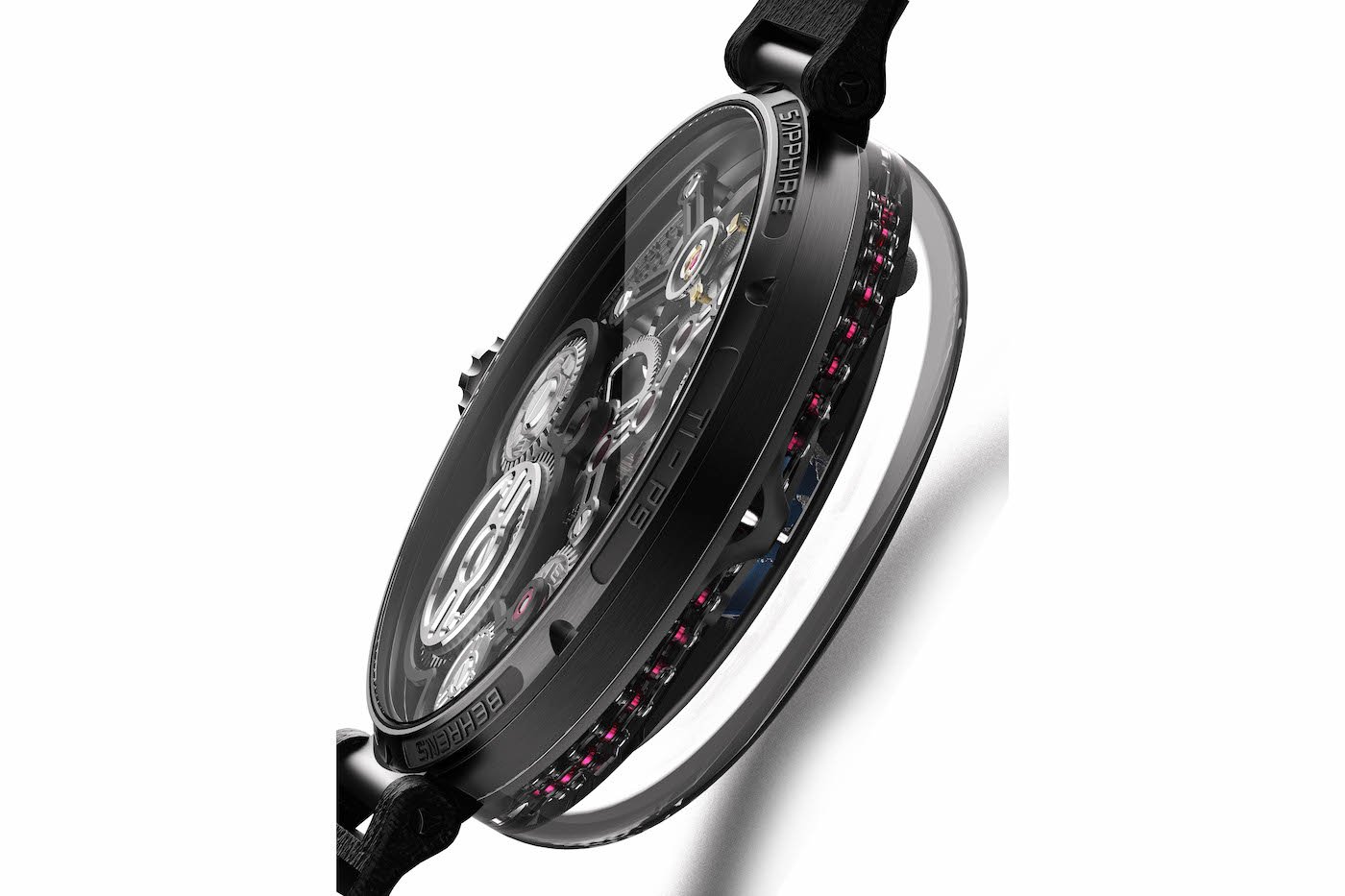 - The B027 Perigee featuring Behrens’ first in-house movement is equipped with a ruby chain hour display system to minimise friction, improve overall efficiency and avoid energy loss. A dome-shaped globe represents the day/night indication, while a new Moon-tracking system represents the satellite orbiting the dial.