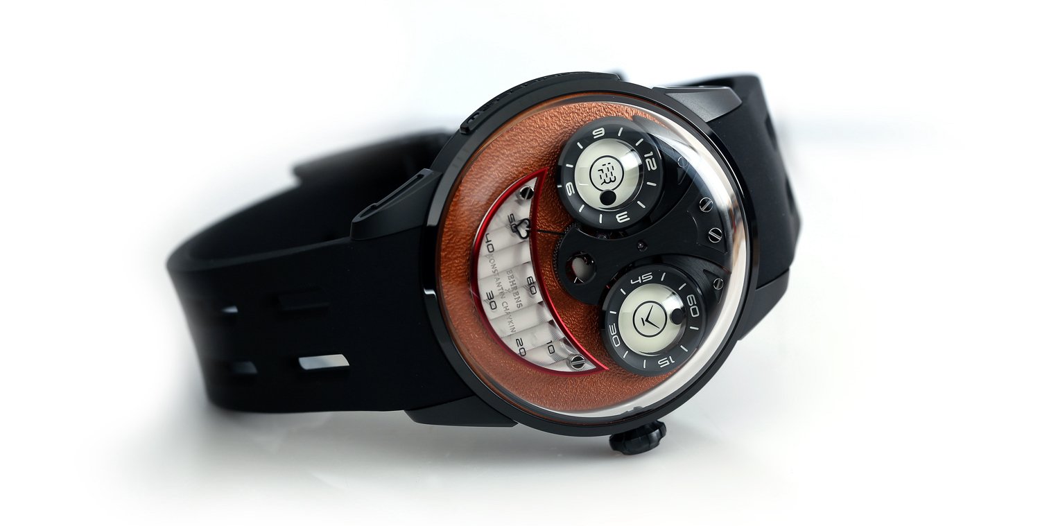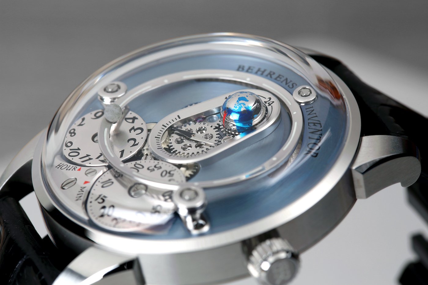 - The inspiration for the new Orion One automatic wristwatch, featuring Behrens’ classic “time display on a circular axis” concept, came from imagining the “Mothership” that aliens might use for travelling to Earth. The case features some 40 shaped and polished facets. Thanks to a newly designed and patented lever-type winding/time setting mechanism, the crown has been replaced by a hidden lever.