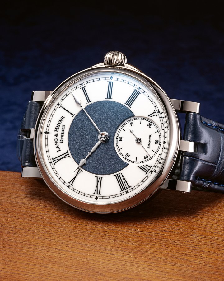 The Friedrich III Remontoir Sincere Platinum Jubilee Edition from Lang & Heyne has been specially created to commemorate the 70th anniversary of Sincere Fine Watches in Singapore. This finely crafted model features a ceramic dial with a central decorative plate in sand-blasted royal blue silver, creating a 3D effect thanks to the tiered arrangement of the three parts of the dial. It is powered by the VI-I calibre with its distinctive triangular bridge, whose remontoir complication ensures the visual appeal of the jumping seconds on the dial while effectively regulating the movement.