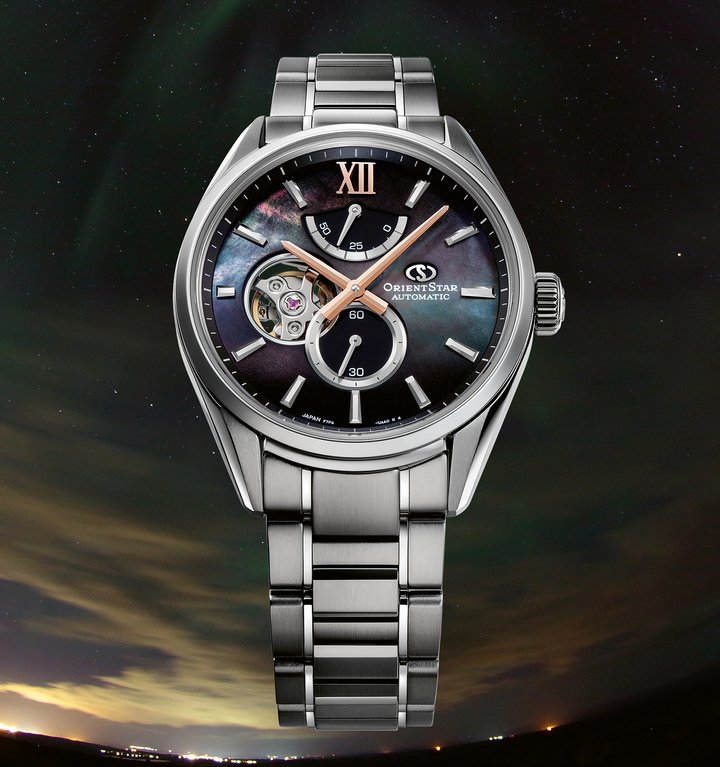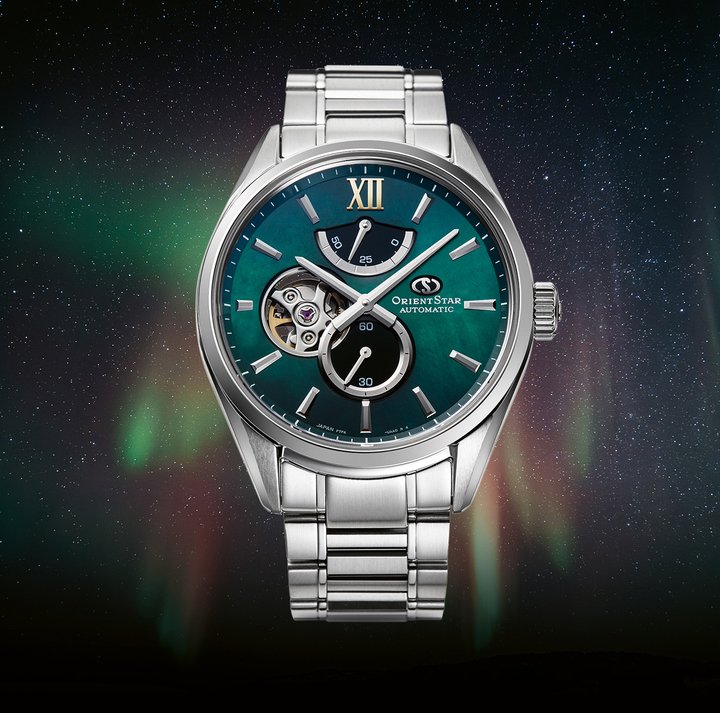 The Orient Star M34 F7 is a new, semi-skeletonised model in the grand tradition of the brand and inspired by the star cluster Perseus, the constellation in the northern sky named after the eponymous hero of Greek mythology. Typically, the M34 models have a strong, sharp-edged case (40mm in diameter and 13mm thick) – the key feature of their design – which highlights the mother-of-pearl dials, the naturally graded colours of which express the brilliant, changing colours of the aurora borealis. Three distinct models are available, in blue, green and anthracite. The anthracite model, which comes with a metal bracelet and an additional calfskin bracelet, commemorates the 20th anniversary of the Orient Star Semi-Skeleton and is a limited edition of just 500.
