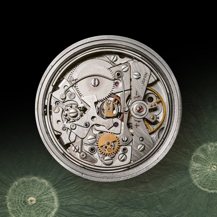 The world’s first automatic chronograph movement, launched in early 1969. Its concise, magic-lever automatic winding and modern vertical clutch greatly influenced later automatic chronograph movements. In addition to the simple construction, flat levers made with a unique stamping process reduced production costs.