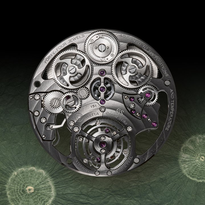 Grand Seiko’s newly developed tourbillon with coaxial constant force. The sound of the constant-force mechanism is synchronised with the ticking of the escapement to create a pleasing musical quality.