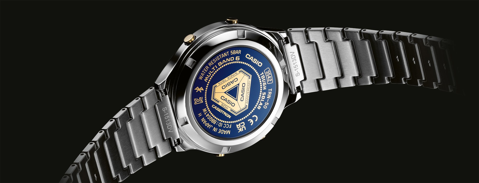 - The Casio Watch 50th Anniversary Casiotron TRN-50SS. The re-created dial features a blue fluted pattern and gold accents to evoke the sky, the sea and sunlight. The screw-lock case back is embellished with the 50th Anniversary logo in a gold tone. The 50th Anniversary lettering reappears on the mirror-polished bicolour bracelet.