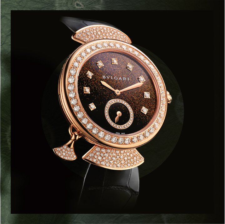A dozen layers of urushi lacquer are applied, over an entire month, to the dial of the Bulgari Diva Finissima Minute Repeater Urushi, finished with a sprinkling of gold.