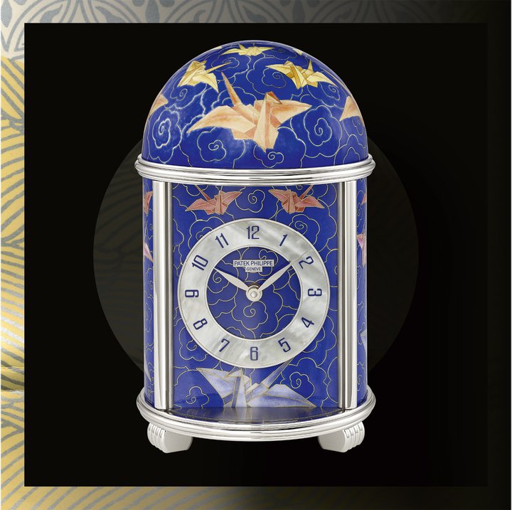 Patek Philippe’s 2023 Rare Handcrafts exhibition featured exquisite timepieces inspired by Japan, including this table clock with origami cranes, created with cloisonné enamel.