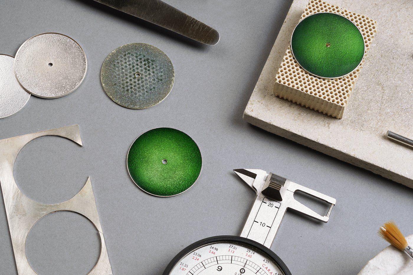 Notably, very few brands produce their own fired enamel dials in-house, because it is a highly involved practice. Its fusion process imparts successive layers of sheer vitreous glaze to a metal dial by firing them in a kiln above 800°C. The exact temperature and timings may differ for each layer depending on the elements and many other variables. In fact, there is no precise recipe for a perfect and consistent outcome every time. As such, this unforgiving execution can throw off even the most experienced craftsmen, thus resulting in extremely high discard rates and manufacturing costs.
