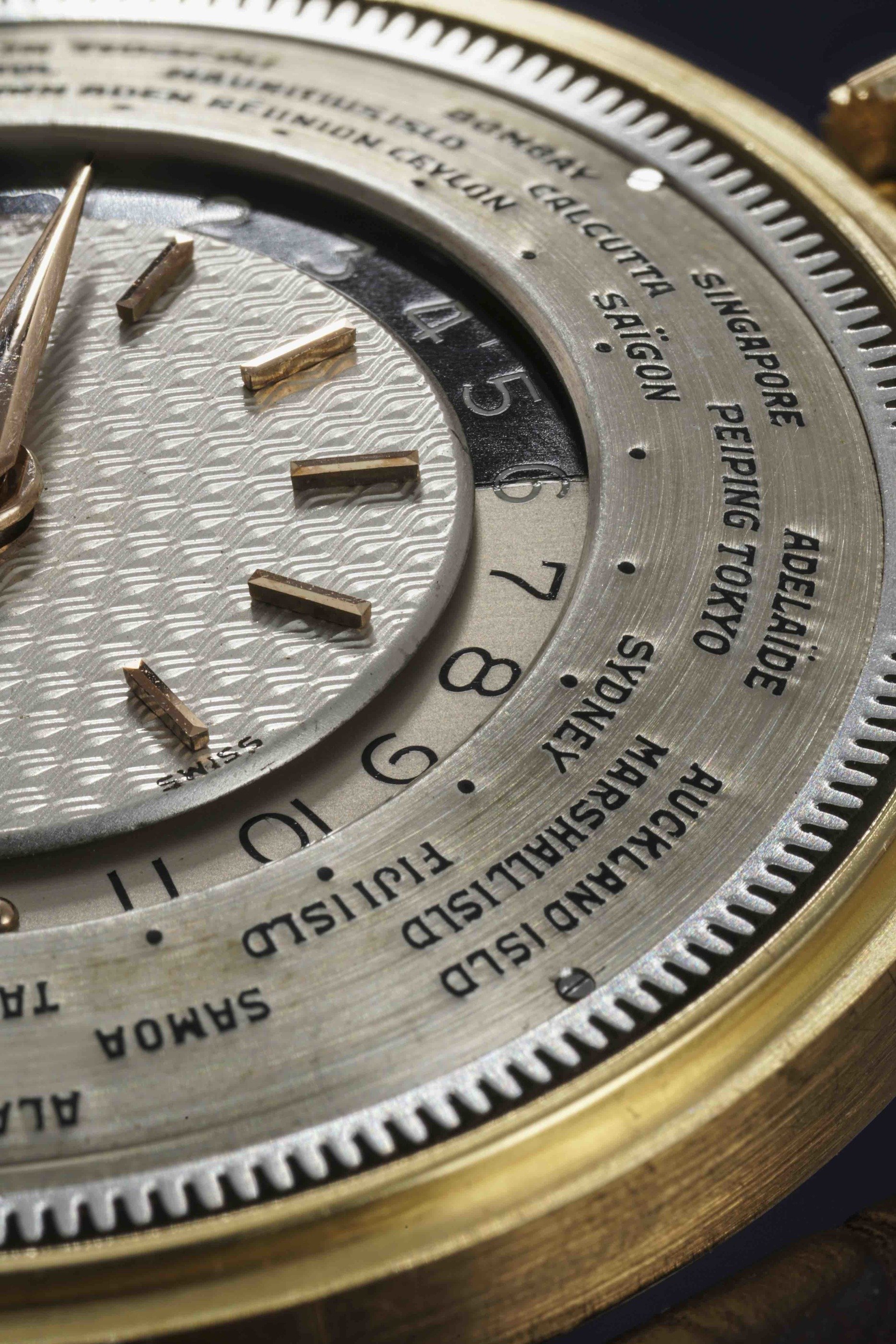 Cottier miniaturized his invention in the late 1930s which first appeared in prototype and pre-series then in the Patek Philippe reference 1415, a single crown model with its bezel engraved with cities to be switched manually. Patek Philippe made Cottier’s invention a staple in their collection creating a variety of models in different case shapes, pocket and wristwatches with simple dials to enamel or lavishly guilloché like this example to be sold by Phillips.