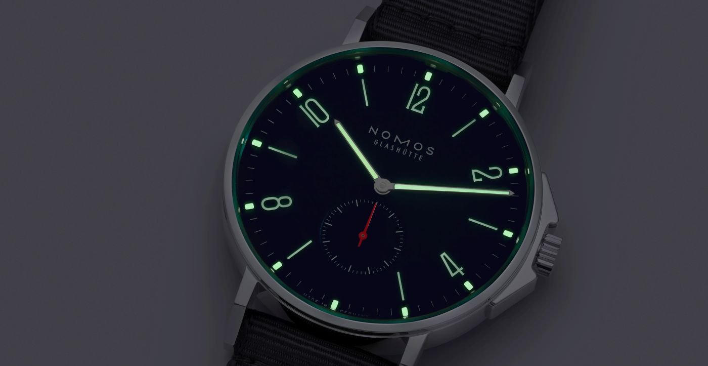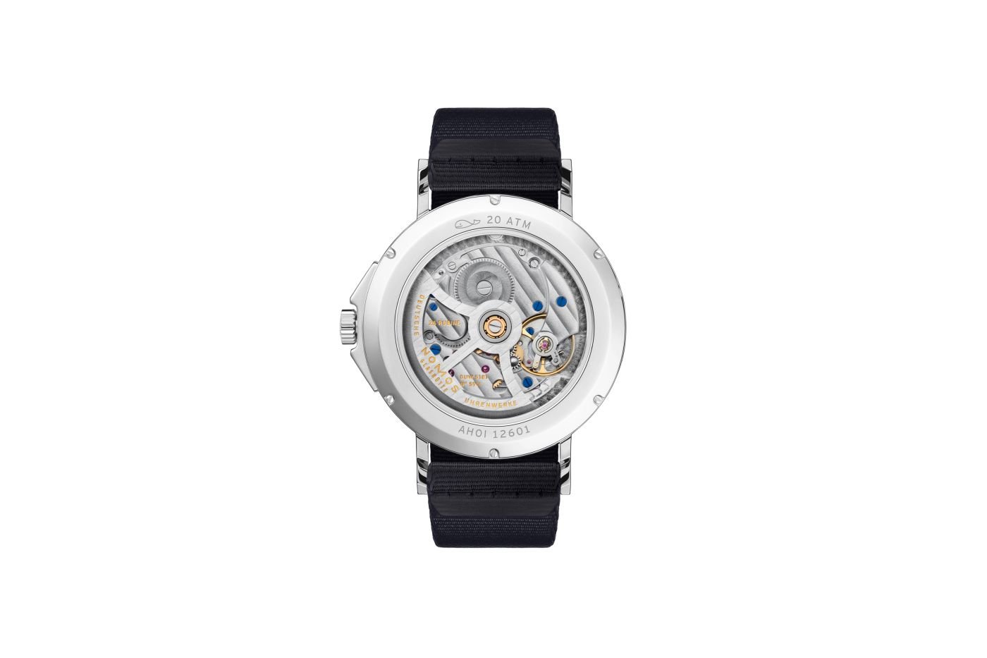 The back reveals a fascinating view of the calibre: The highly precise automatic caliber by Nomos Glashütte is adjusted in six positions and lavishly decorated. It is manufactured in the brand’s own workshop. The small whale indicates a particularly high degree of water resistance: 20 atm, i.e., 20 bar or 200 meters.
