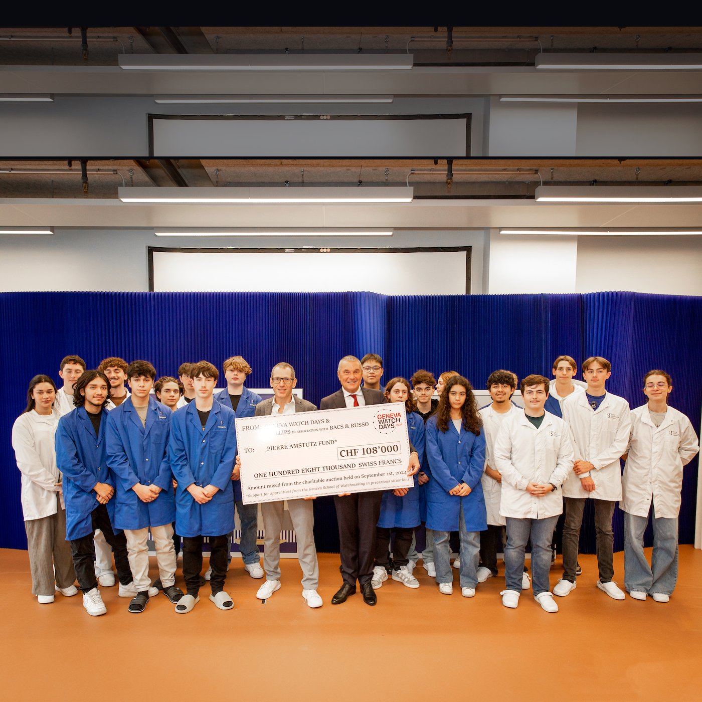 Jean-Christophe Babin presented a check for CHF 108,000 to Stéphane Cruchaud, Dean of the Geneva School of Watchmaking, to support students of the school facing financial hardship. The Bulgari Group CEO and President of the Geneva Watch Days also took the opportunity to share some insights about the 2025 show.