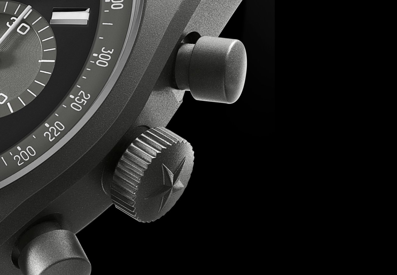In spite of its dark demeanor, the Shadow remains a highly legible chronograph, with grey counters and tachymeter scale subtly contrasting against the deep, matte black dial. The hands and applied markers are filled with white SuperLuminova that emits a bright green glow in the dark. The black rubber strap with a cordura-effect features a touch of white on the stitching, fixed to a microblasted titanium pin buckle that matches the stealthy finish of the case.