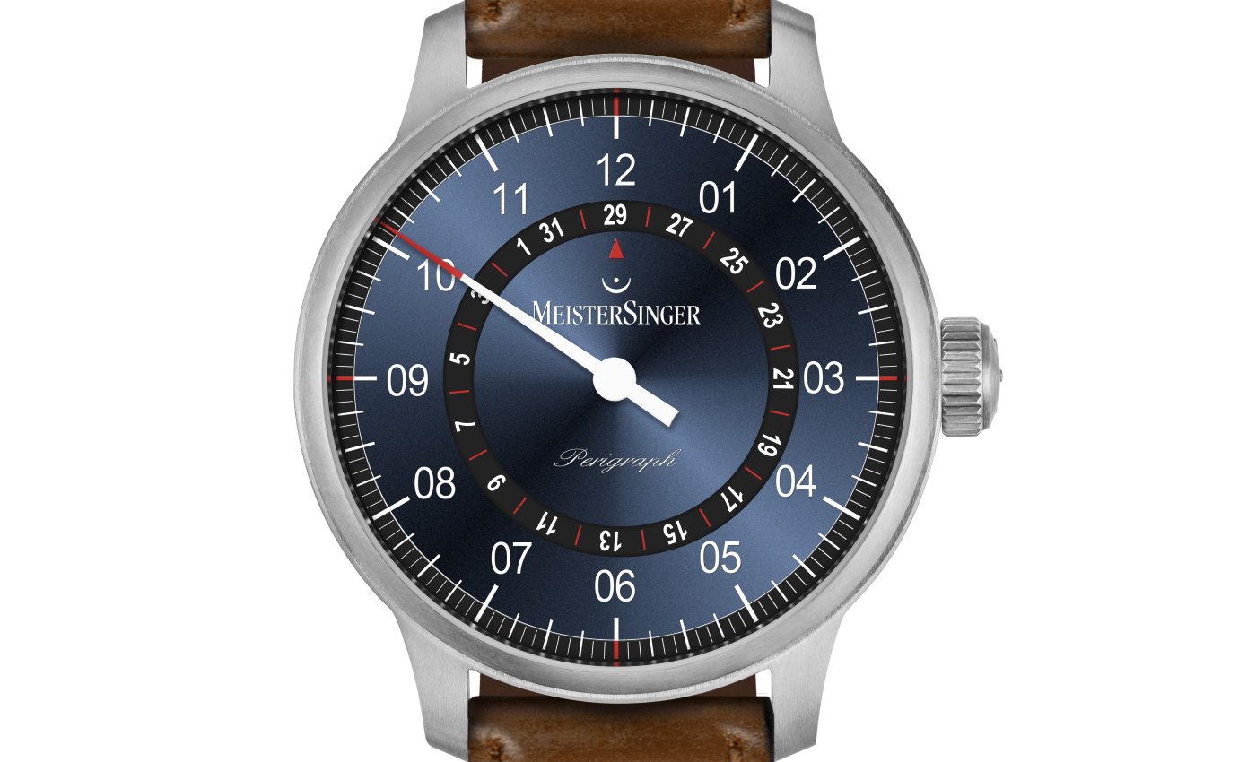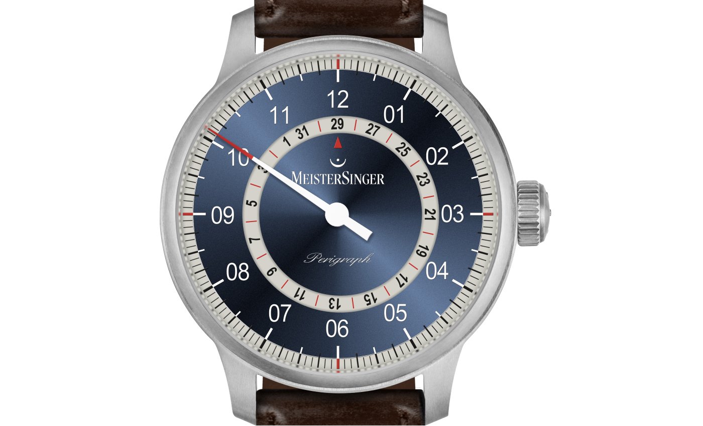 he MeisterSinger Perigraph incorporates two of the company’s design ideals. As a singlehand watch, it was designed for people who don’t care about the passing of seconds but want to keep track of the course of the days and months. It is therefore fitted with an open date ring, which together with a well-balanced typography, gives the dial a symmetrical regularity. Until now, this date ring was always the same color as the surrounding dial, and only differed in the fact that it was somewhat recessed.