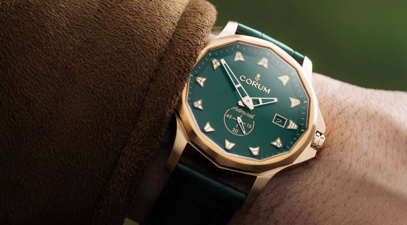 Faithful to the nautical roots of the Admiral collection, the model features the 12 pennant-shaped hour markers on the dial. The nautical colour palette of navy blue or maritime green dial fit perfectly with the associated colours alligator straps. Equipped with a Corum automatic movement visible through the sapphire case back, the watch features a small second at 6 o’clock and a date at 3 o’clock.