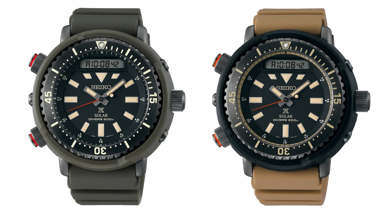 Each of the four new watches features an outer case protector, which has been the most iconic design of the original watch. SRPE29 and SRPE31 are the first two mechanical watches in this series, equipped with Seiko’s 4R36 movement. SNJ029 and SNJ031 are the modern versions of the Hybrid Diver’s from 1982, which is also loved by fans and given the nickname “Arnie’’. Both analog and digital displays are available.