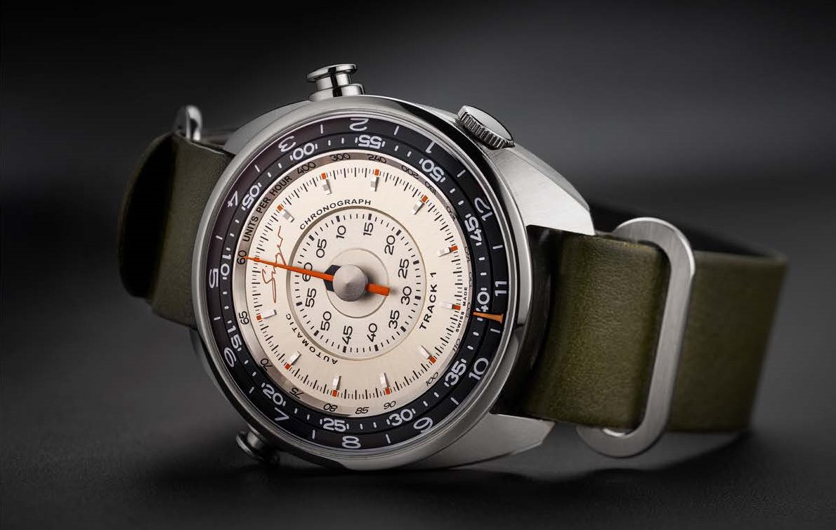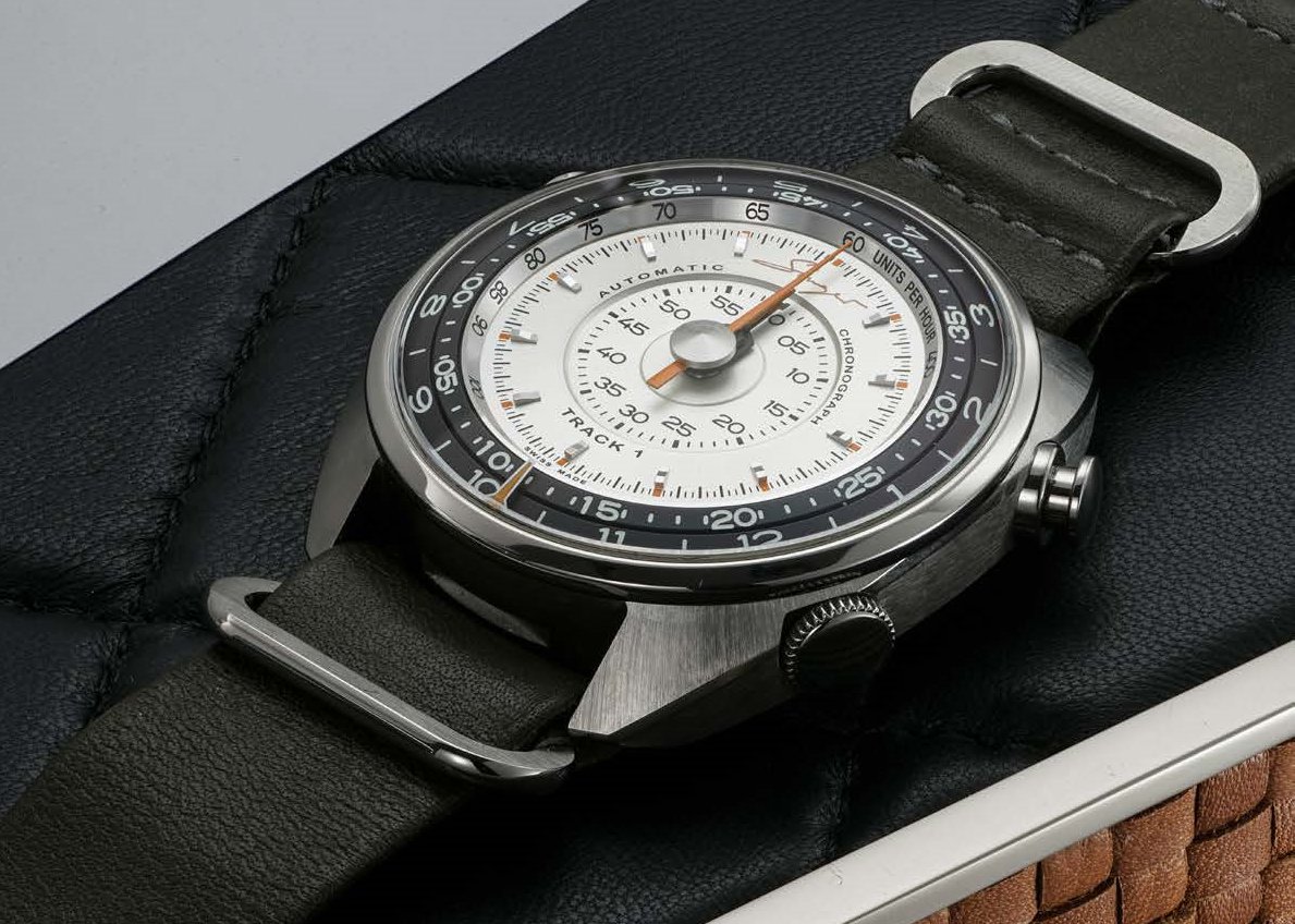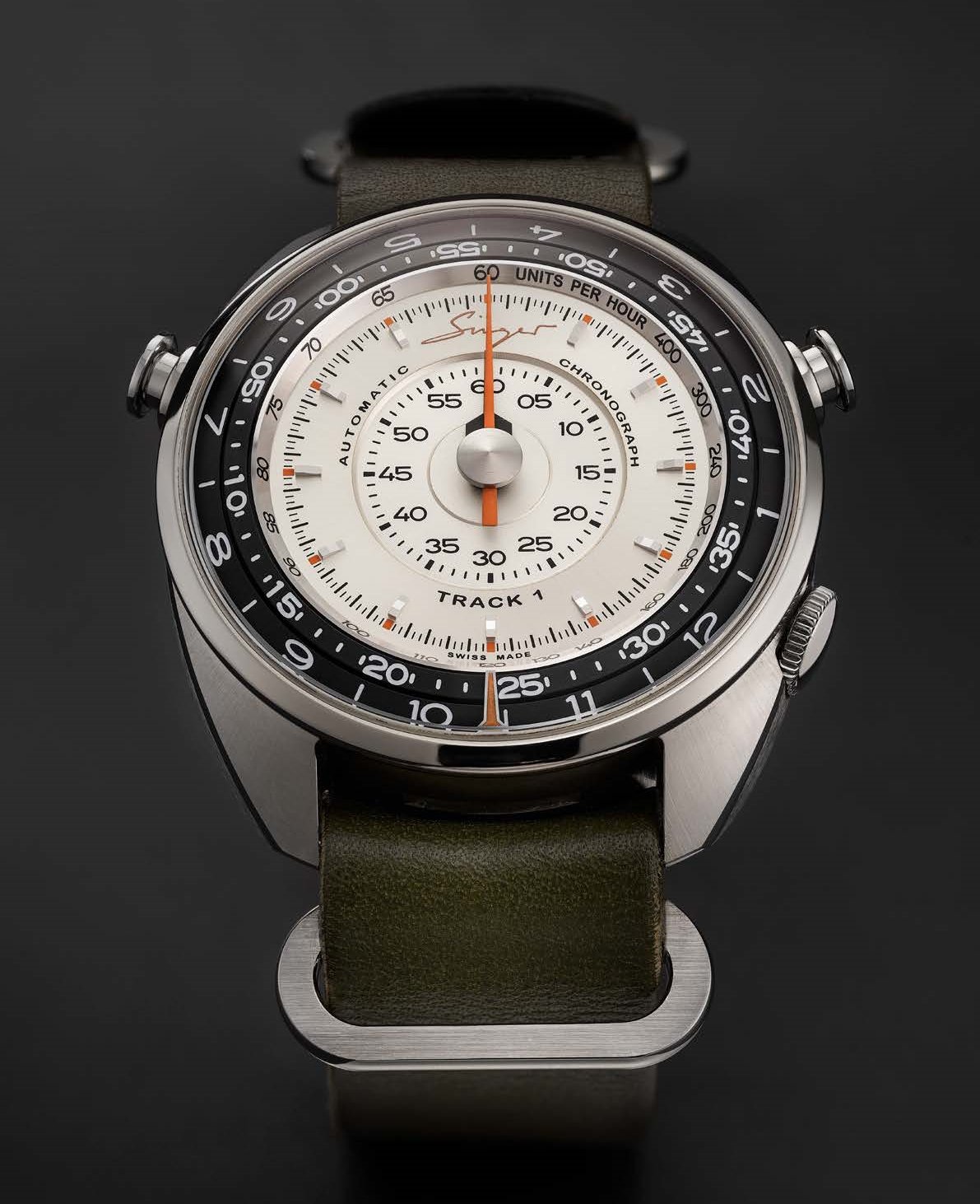 Although their primary function is displaying the time, the raised hour and minute discs are an integral part of the design, re-interpreting the bezels of 1960’s racing chronographs in a whole new dimension. In line with this sporty, motoring inspiration, the Singer Track1 also features a tachymeter scale along the flange.