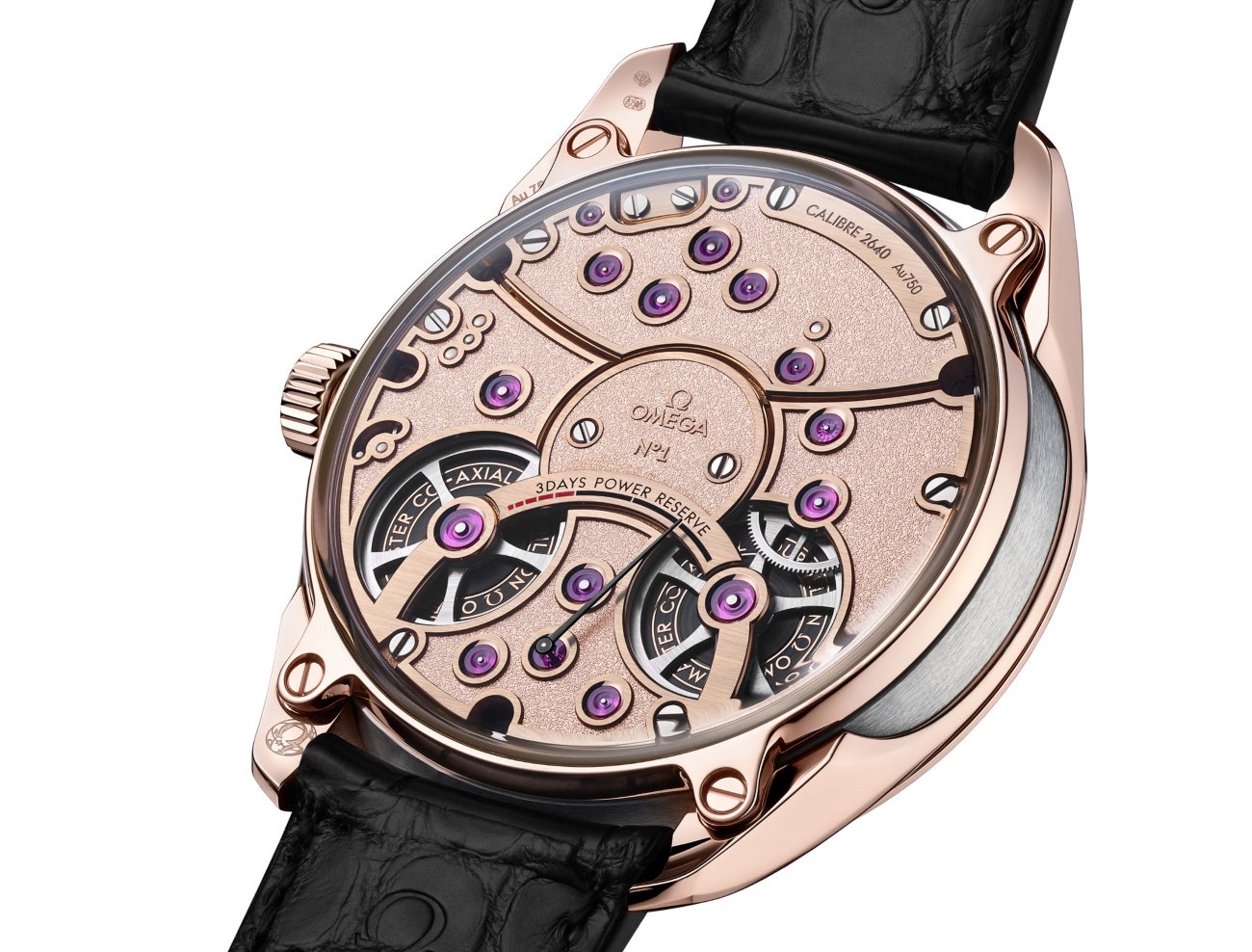 Customers can view the impressive Omega Co-Axial Master Chronometer Calibre 2640 through the sapphire crystal caseback, and also note its 3-day power reserve indicator. To add luxurious beauty, the bridges and mainplate are made from 18K Sedna™ gold, and have been hand-bevelled for a decorative finish.