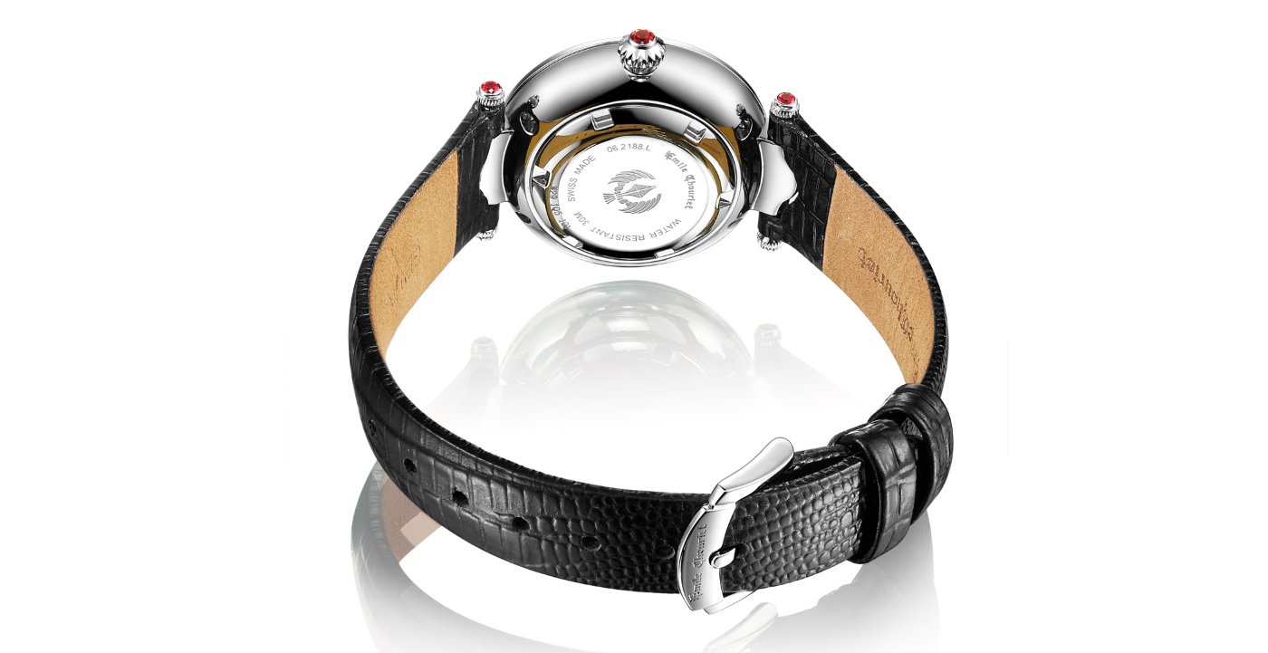 Perfectly proportioned for women’s wrists, the round stainless steel case of the Fair Lady measures 29.2mm wide, with a concave bezel that provides a soft curvature to the case. The crown and uniquely shaped lugs are inlaid with red Swarovski crystals that accentuate the deep tones of the dial. Completing the watch is a black leather strap. Powering this work of wearable art is the calibre EC5316, an automatic ETA-based movement with a power reserve of 38 hours when fully wound.
