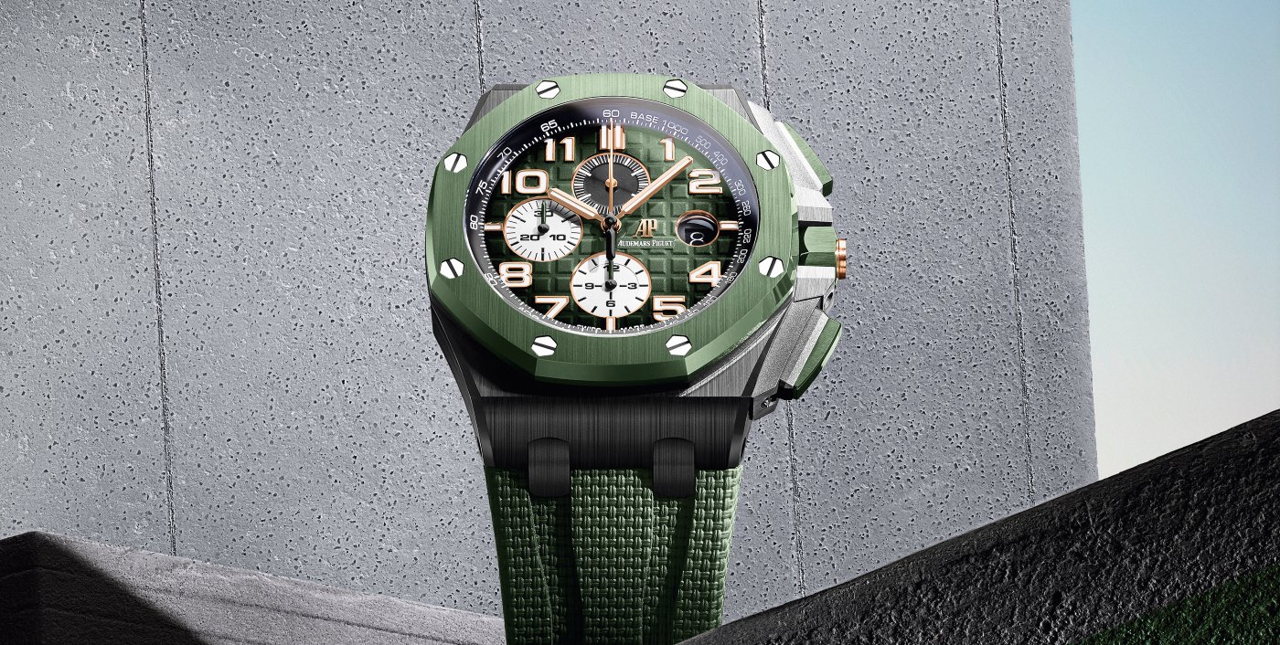 udemars Piguet now offers its Royal Oak Offshore collection with a choice of smoked blue, green or grey dials, each incorporating the Manufacture’s “Mega Tapisserie” pattern and new Arabic numerals which supplant the customary applied hour-markers.