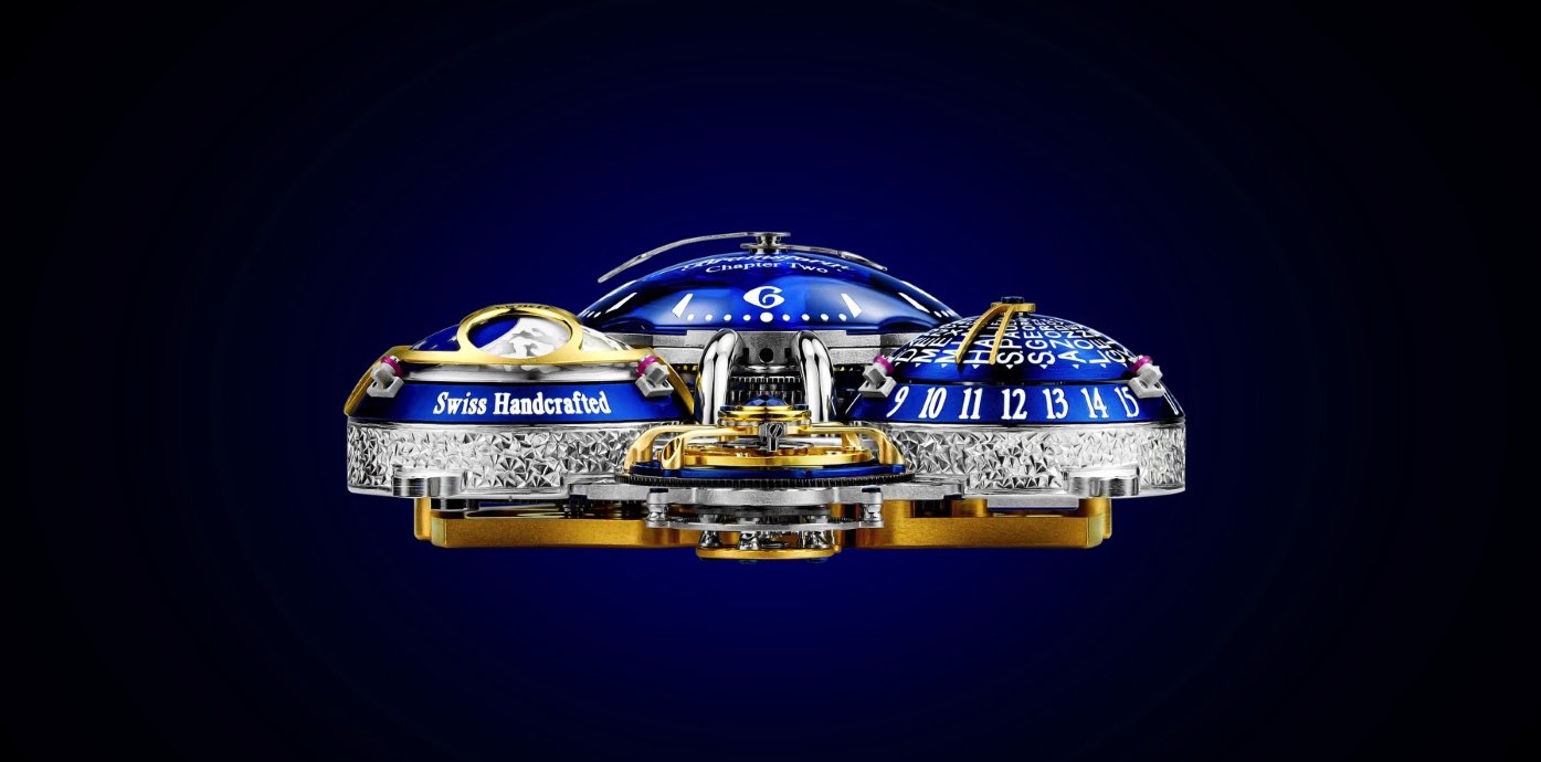 he Brainstorm Chapter Two is the second timepiece in the Bovet collection to be fitted with a sapphire crystal case in the emblematic writing case with an asymmetrical profile imagined by Mr. Pascal Raffy in 2016. The slope of its bezel allows the collector to explore new display mechanisms that guarantee intuitive and increased readability. Concentric rollers, rotating domes, and three-dimensional needles were used to express time in new ways.