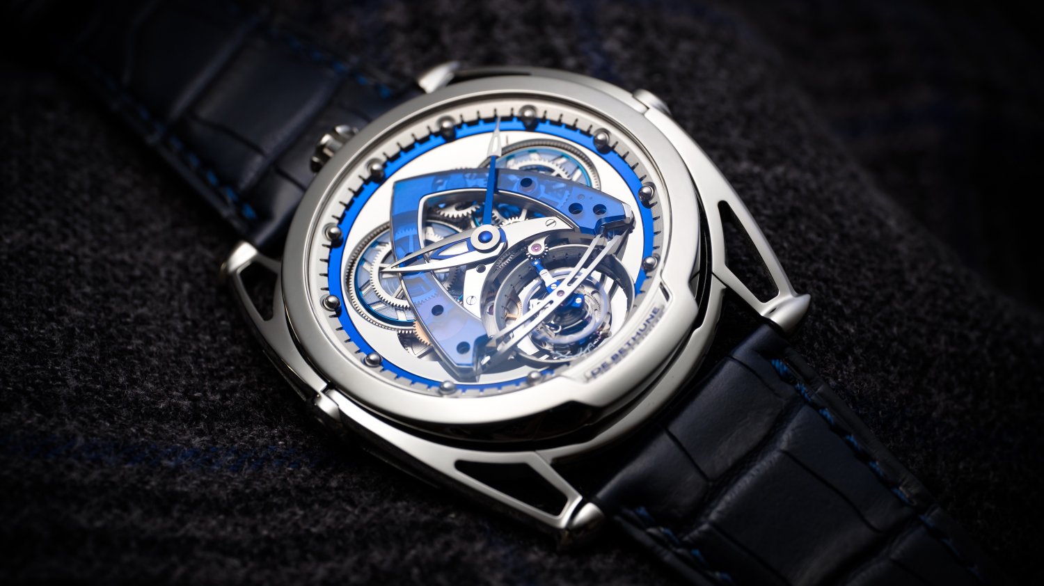 e Bethune presents the iconic DB28 Steel Wheels now for the first time equipped with a tourbillon. The movement’s delta bridge and two barrel covers are made of sapphire crystal. Faithful to the DNA of the ‘Maison’ nestled in Sainte Croix in the Swiss Jura mountains, the DB28 Steel Wheels Sapphire Tourbillon ably perpetuates the heritage of its predecessors: perfect balance, contemporary and bold aesthetics at the service of exceptional mechanics. A limited edition of only 10 pieces.