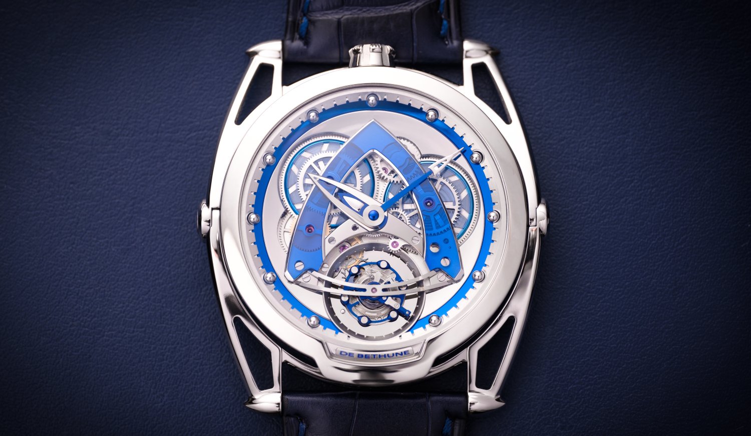 Most often used in the production of watch cases, sapphire crystal takes on a new role for De Bethune. Here, it finds a new vocation in the form of the signature delta-shaped bridge and the cover for each of the two barrels. Blue for the bridge, clear for the barrel covers, these elements are integrated into the movement, letting light in to play and offer new reflections – and allow the eyes to literally plunge into the mechanism.