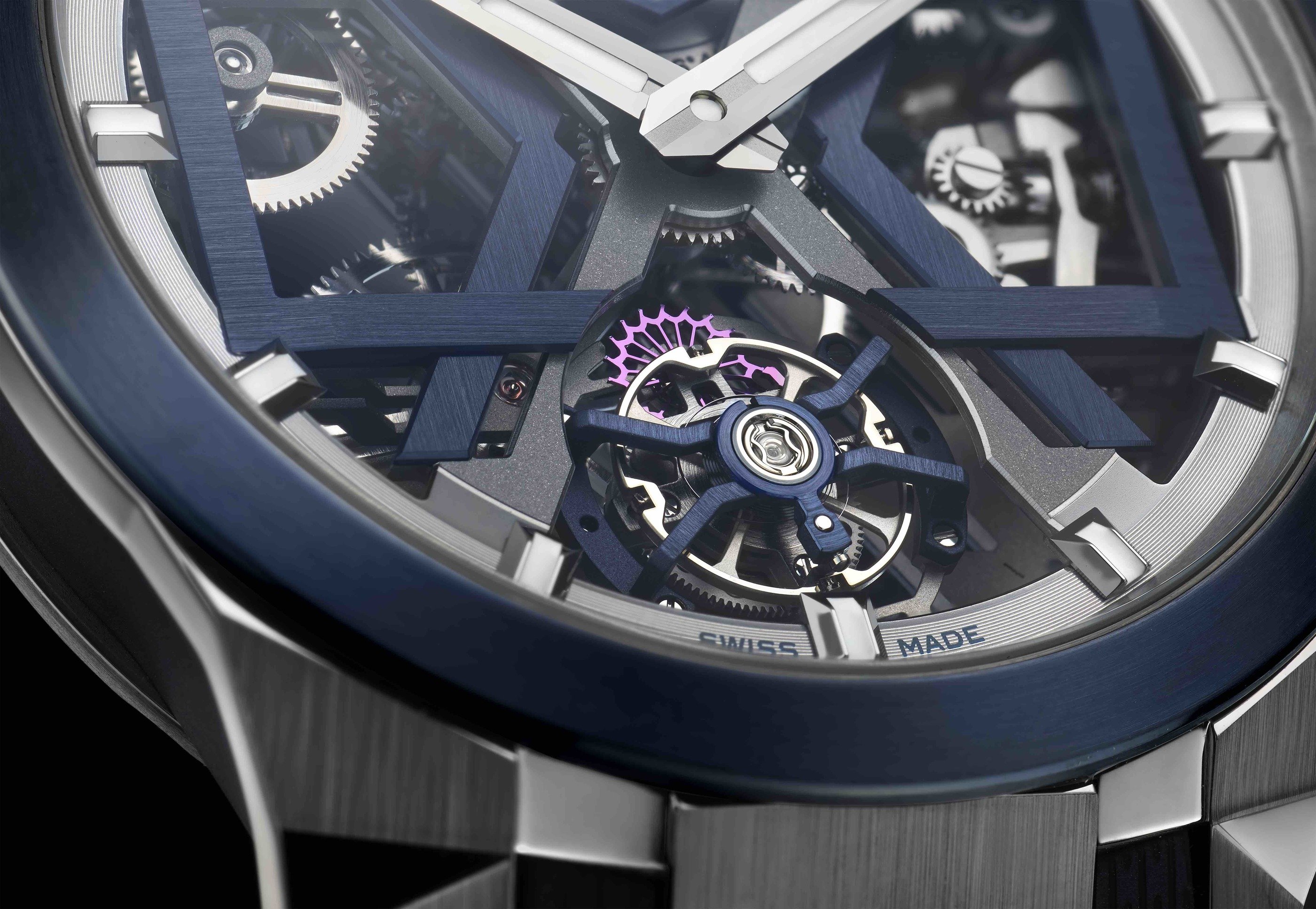 he new Ulysse Nardin collection Blast has been in work for almost 2 years and is playing off the transparency of its new powerful automatic silicium tourbillon nested in a bold, X-shaped cage, which beats inside at a frequency of 2.5 Hz. Light penetrates the open-worked body of the watch like a laser.