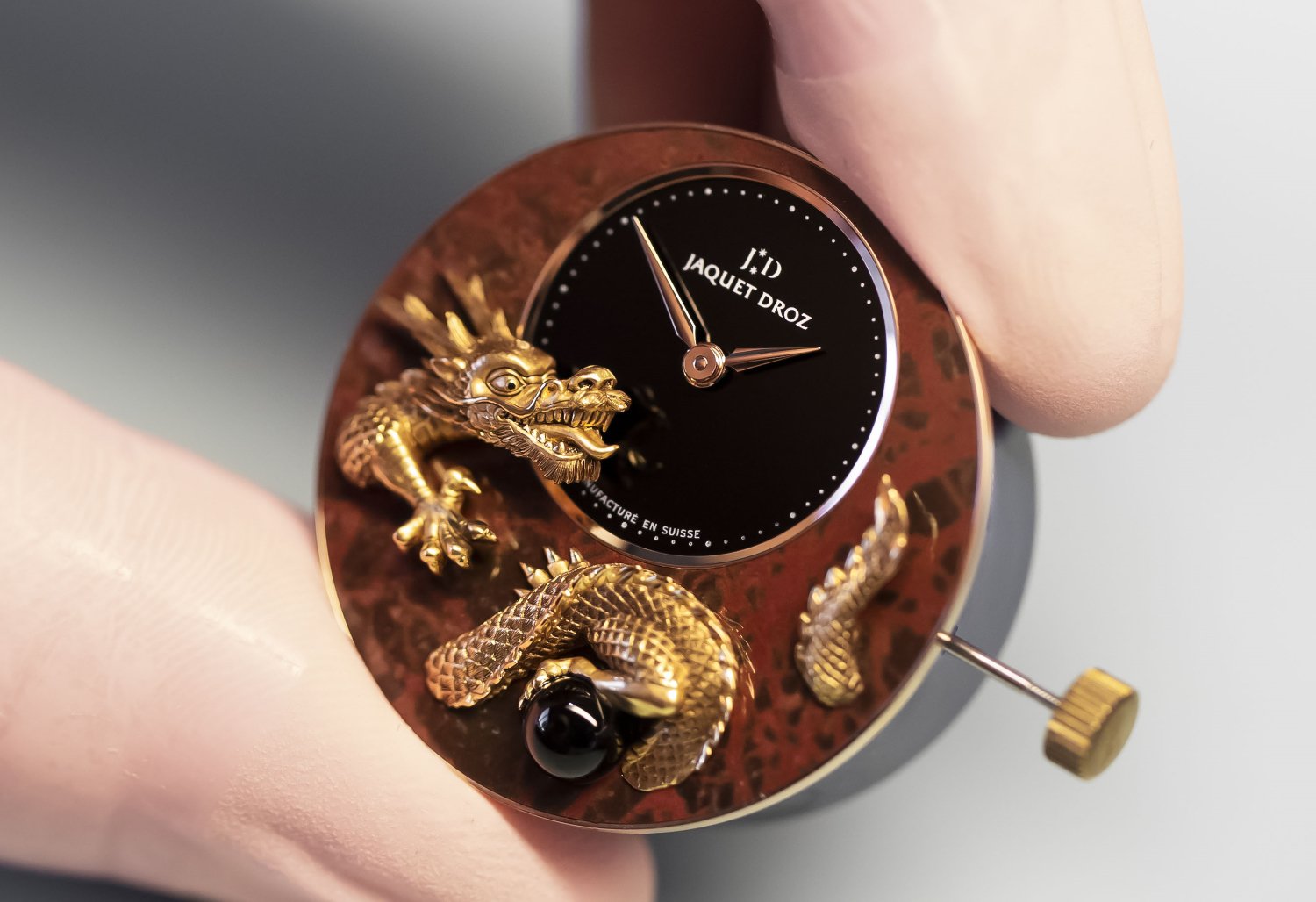 Jaquet Droz presents a very exclusive interpretation of the Earth Dragon, the fifth element in the 60-year cycle of the traditional Chinese calendar. For this new creation, in a series strictly limited to 8 pieces (Numerus Clausus), Jaquet Droz has chosen its Petite Heure Minute as its canvas. With its off-centered dial at noon, it offers a large surface on which Jaquet Droz has skillfully deployed the magic of its Ateliers d’Art.