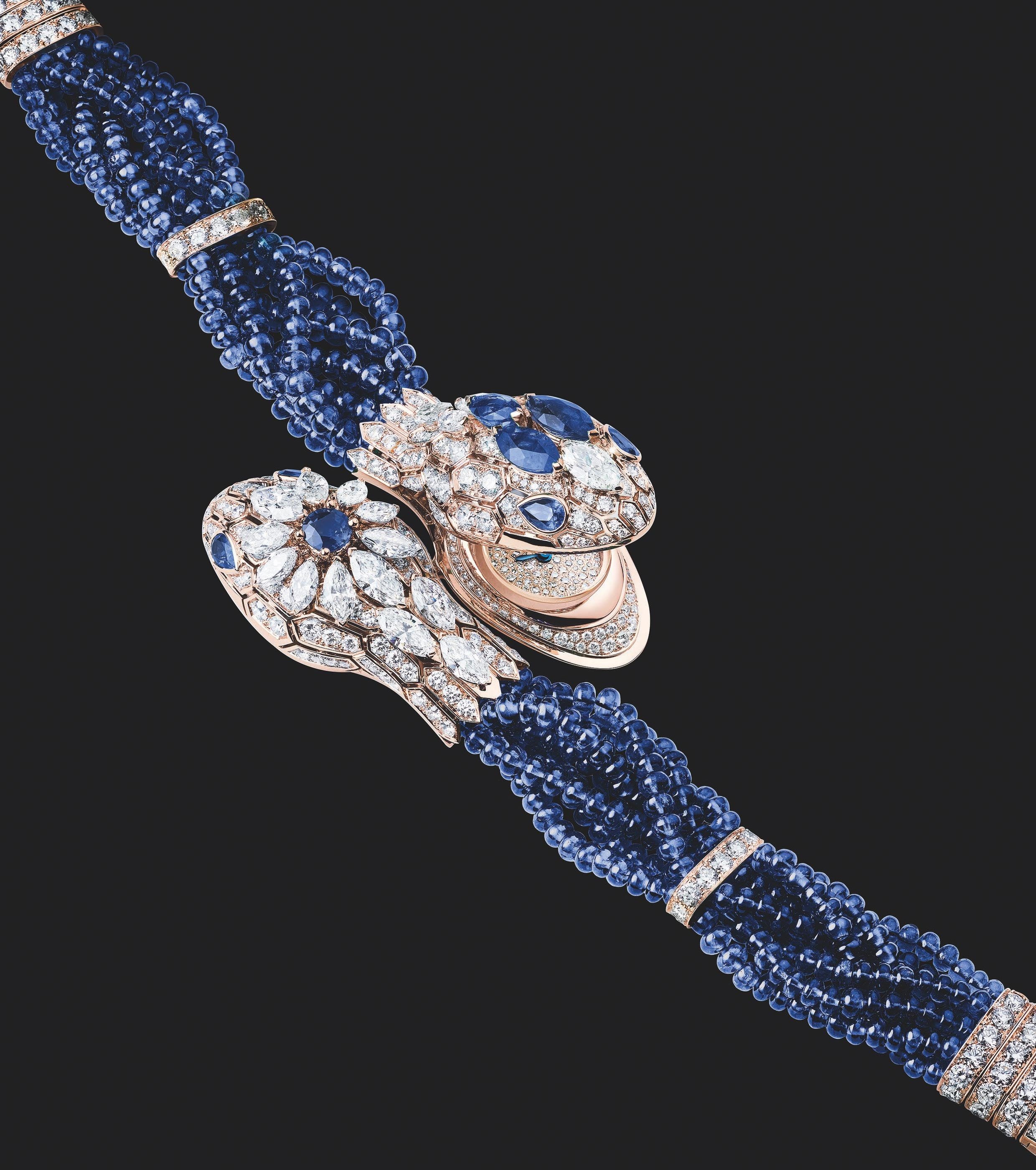 Crafted in 18-kt rose gold, the new Serpenti Misteriosi Intrecciati secret watch features two linked Serpenti snakeheads, one of which houses the watch. Set on a bracelet made with 426 sapphire beads totaling over 100 carats, the new Serpenti model is embellished with sapphires and diamonds of var ious shapes.
