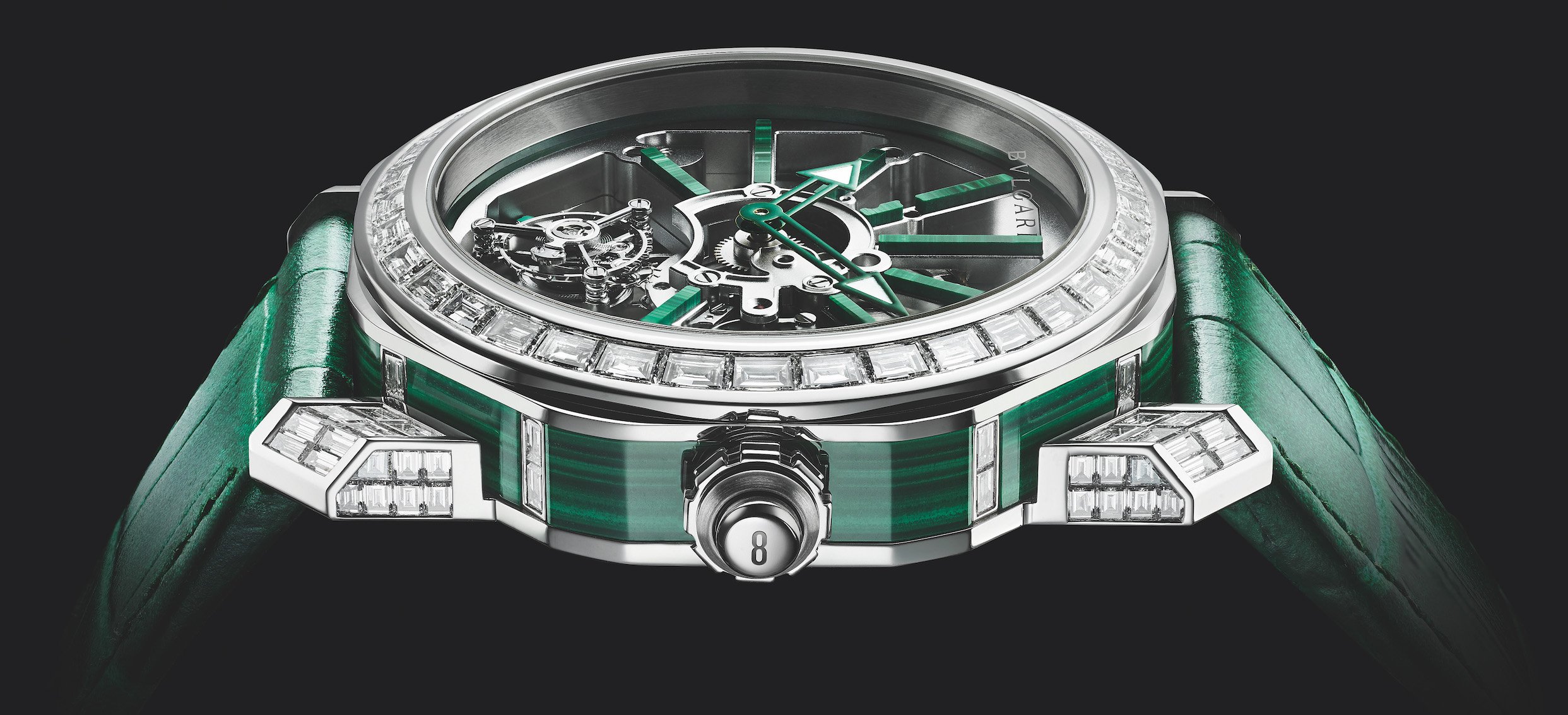 first new model is the Octo Roma Tourbillon Sapphire Malachite. Bulgari jewels are known for their color and exuberance, a story told through the use of unexpected materials and rare combinations. Now, the brand brings this aesthetic to men’s timepieces through the introduction of watches using hard stones such as malachite, jade and lapis lazuli.