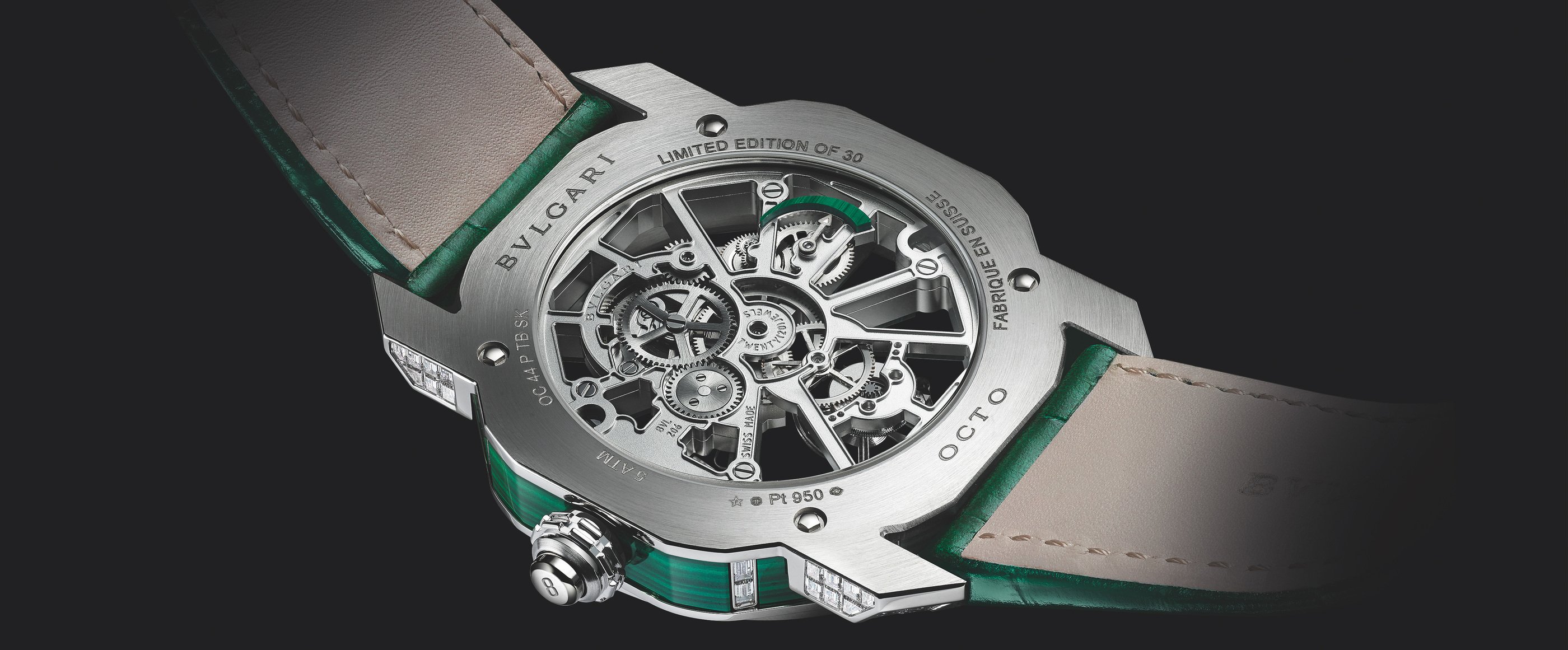 A new malachite version of the Octo Roma Tourbillon Sapphire debuts with a limited edition of 30 pieces. The stone of kings, malachite was used in the Grand Trianon in Versailles, in St. Petersburg’s Cathedral St. Isaac’s, and is used to mark the 13th wedding anniversary. Though the Ural Mountains are home to some of the largest malachite mines, Bulgari’s stones are sourced in the Congo for the highest possible quality.
