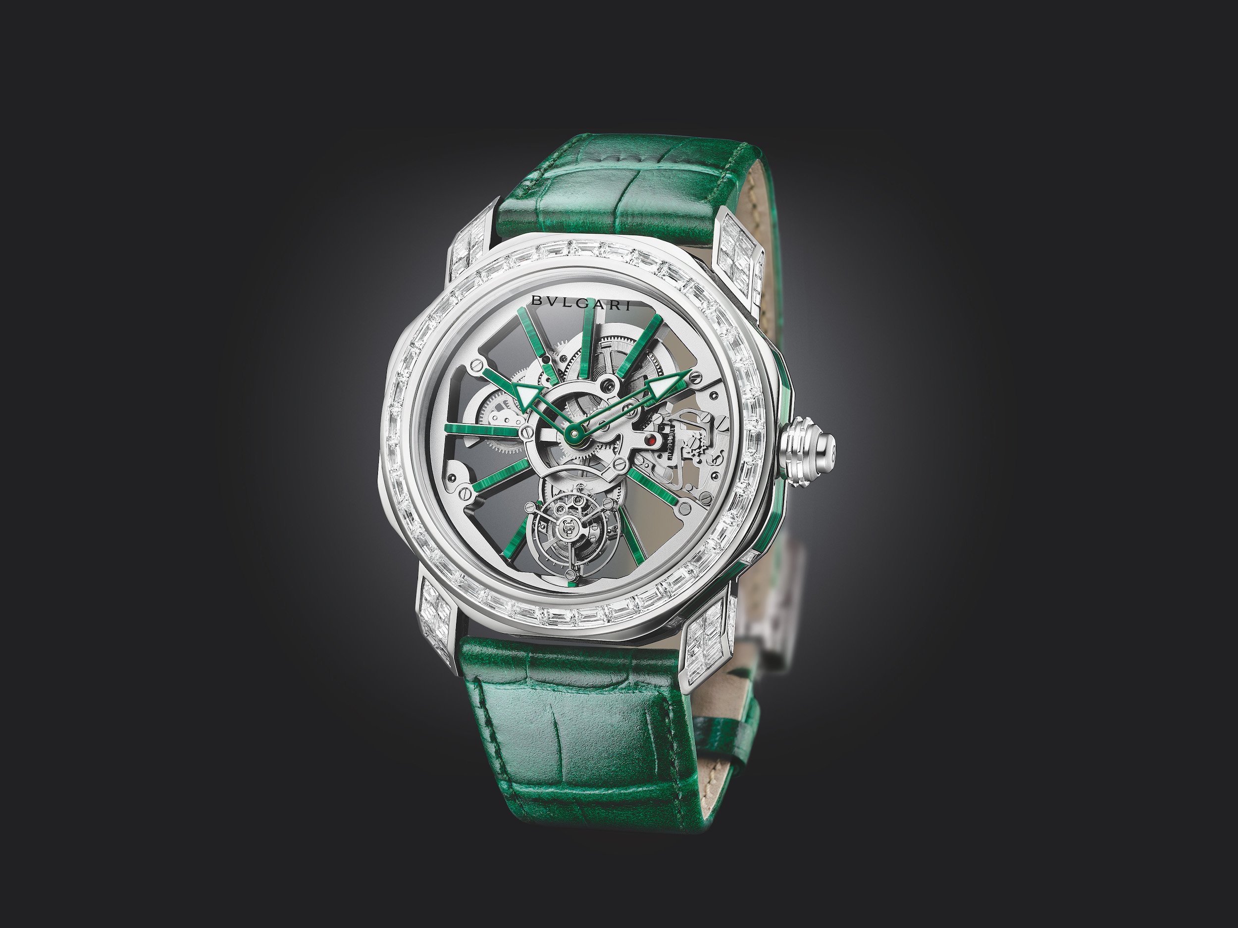 The new watch features a Mechanical Manufacture movement with flying tourbillon and manual winding BVL 206 caliber. Its 44-mm platinum case is set with baguette-cut diamonds and an 18-karat white gold crown. The middle case is crafted in malachite and the 18-karat white gold caliber decorated with malachite indexes — a feature that is only made possible through an exacting level of precision and artistry. The watch is worn on a green alligator strap with an 18-karat white gold folding clasp set with baguette-cut diamonds.