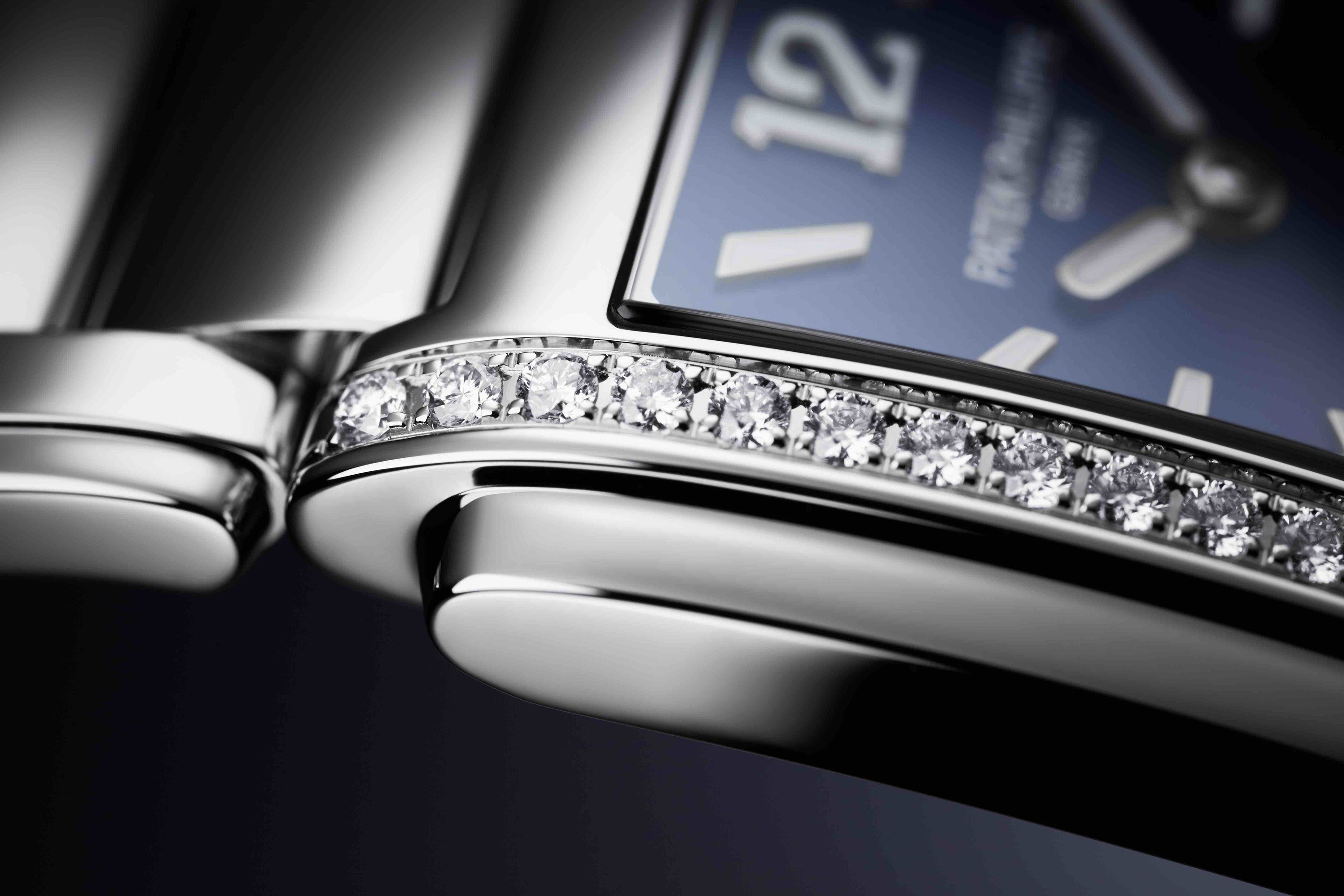 The distinctive shape of the two-tier rectangular case is underlined by two rows of 18 Top Wesselton Pure diamonds (approx. 0.42 ct) set with textbook precision. A Calatrava Cross, emblem of the Patek Philippe manufacture, embellishes the crown. The supple, comfortable bracelet, fitted with a fold-over clasp, is a jewel in its own right. Each component is manually finished and fully polished. The Patek Philippe caliber E15 quartz movement is made with the same devotion to fine workmanship as the manufacture’s mechanical movements.
