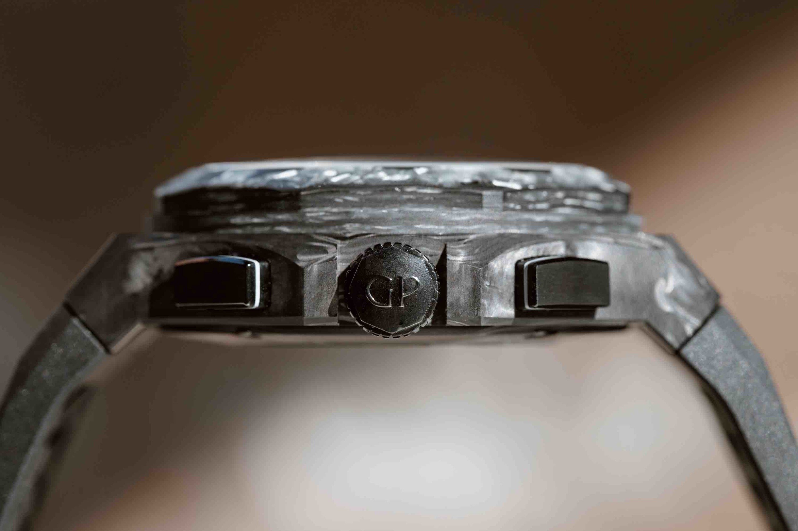 Now, Girard-Perregaux is pleased to release the next chapter in this remarkable story, the Laureato Absolute Crystal Rock, a futuristic design that upholds the brand’s reputation for no-compromise craftsmanship. Measuring 44m in diameter, this new chronograph is housed in a case formed of Carbon Glass. Carbon Glass is strong and very light. Indeed, the Laureato Absolute Crystal Rock weighs just 94 grams. This high-tech material combines layers of carbon fibre and fibreglass which is subjected to high temperatures and pressure to form a homogenous material. Thereafter, the material is milled into the desired shape. The resultant case exhibits a matte, slightly textured finish. Interestingly, the constituent layers create uneven strata within the material and are randomly aligned, making the appearance of each case unique and every watch exclusive.