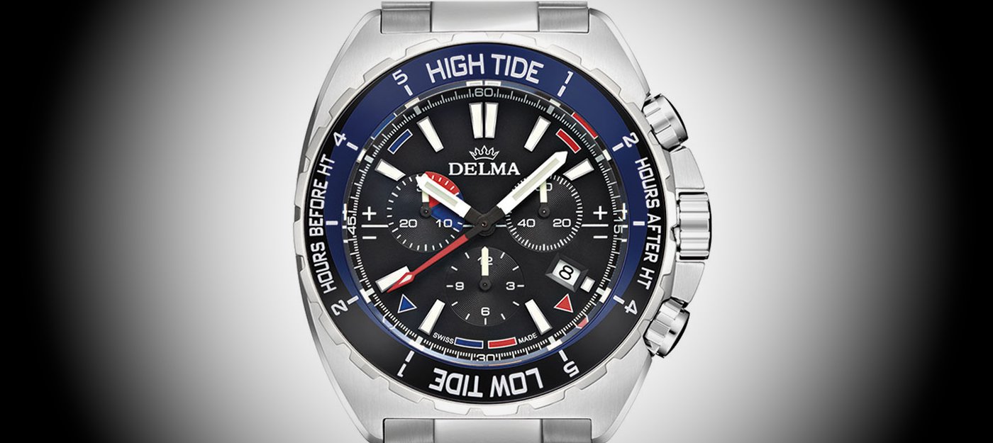 With the Oceanmaster Tide, Delma introduces a tidal tracking feature to its cherished series of Oceanmaster timepieces. This new component enables tracking of the ebb and flow of the sea at port or in the most extreme and remote locations. With high and low tide clearly indicated on the sleek bezel, aquatic adventurers will always be aware of tidal conditions.