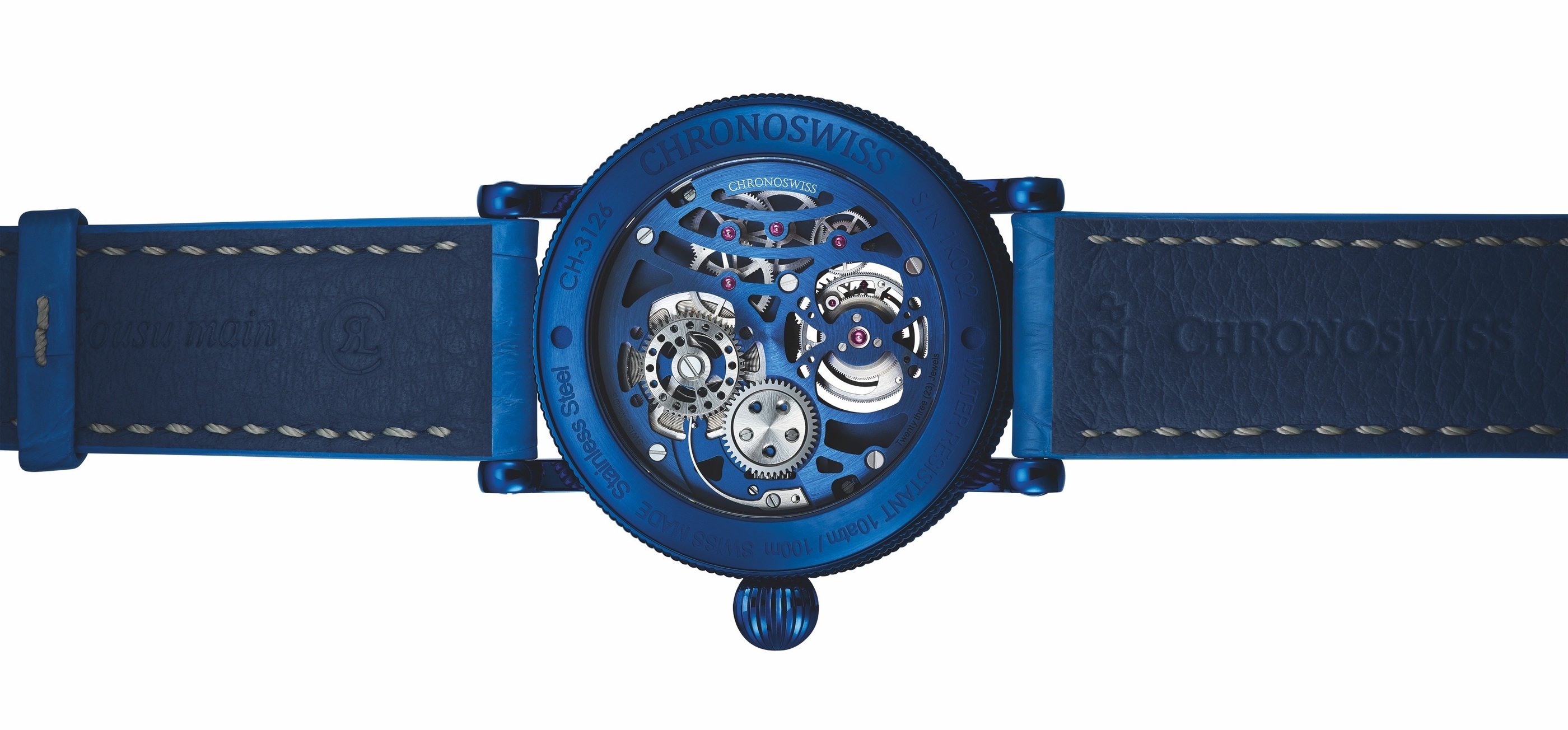 The watch dial is an elaborate 42-part construction on two levels: the bottom level is hand-guilloched, whereas the upper level features skeletonised train wheel bridges and a funnel-like construction for the hour display. Other design details include all particular signifiers of a Chronoswiss watch: knurled bezel, onion crown and the hornback crocodile strap held in place with the patented Autobloc system. There is also a not-to-be-seen special engraving on the reverse side of the dial – for a unique melding of modern mechanical watchmaking and heritage, since the idea of a secret signature was in vogue around two centuries ago when the tourbillon was invented.