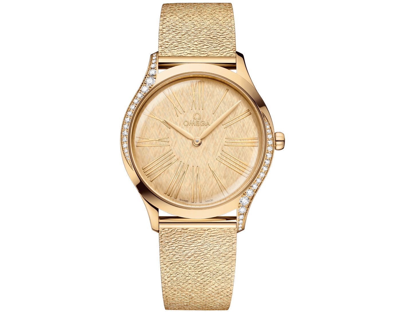 hree new Omega Trésor models are sized at 36 mm, with cases crafted entirely from 18K Moonshine™ gold. First introduced in 2019, this distinctive alloy is inspired by the moonlight in a dark blue sky. It offers a paler hue than traditional 18K yellow gold, and also has a high resistance to the fading of colour and lustre over time.