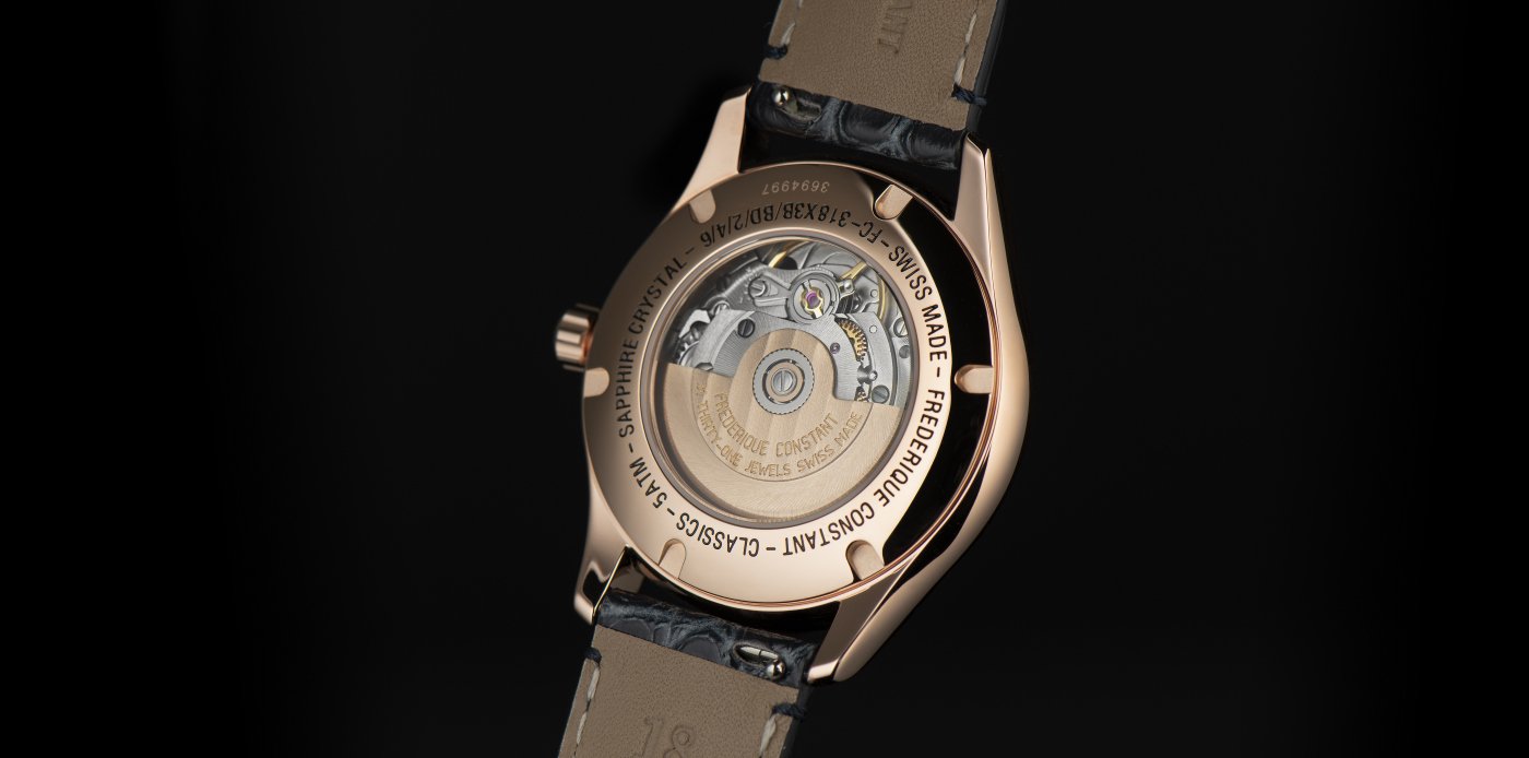 Each timepiece is complemented by a date window at 6 o’clock. For that all-important finishing touch, this has been highlighted by a border the same colour as the case (rose gold or steel). On the back, each piece features a sapphire crystal that allows to see the beating heart of the piece, the self-winding FC-318 movement guaranteeing a power reserve of 38 hours.