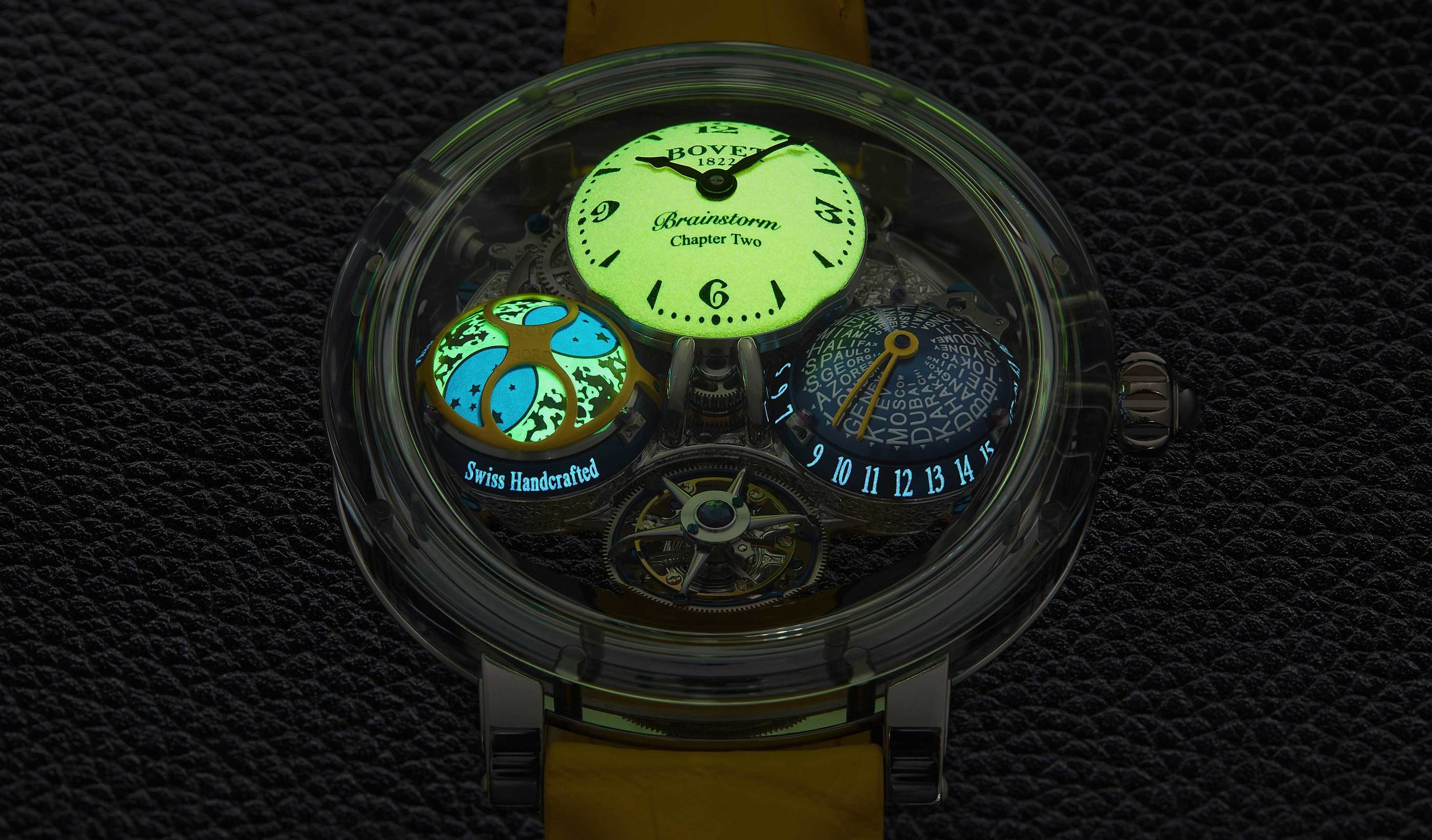 The new Récital 26 Brainstorm® Chapter Two Sunshine is available in fully hand-engraved movements, all in the crafted monoblock Sapphire “Writing Slope” case (47.8 mm). It features a yellow dome-shaped dial, hand-coated by the Bovet artisans with a green Super-LumiNova® (SLN) that gives the dial a powder finishing to the surface.