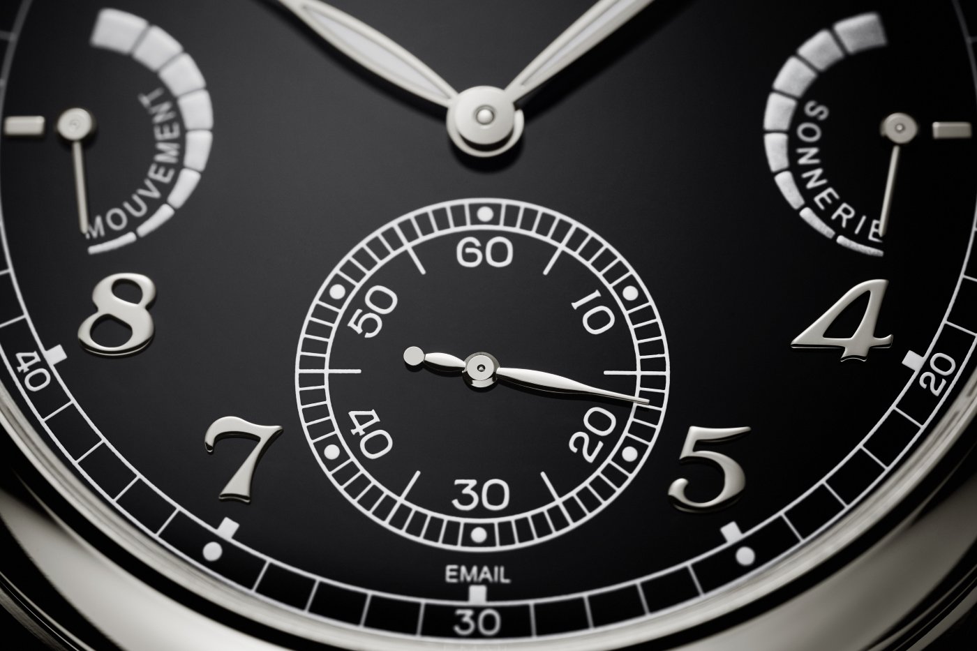 The displays for the hours, minutes, and subsidiary seconds at 6 o’clock are well proportioned alongside two power-reserve indicators for the movement and the strikework at 3 and 9 o’clock with semicircular scales identified with the inscriptions MOUVEMENT and SONNERIE. The timepiece is worn on a hand-stitched shiny black Alligator strap with square scales and a fold-over clasp.