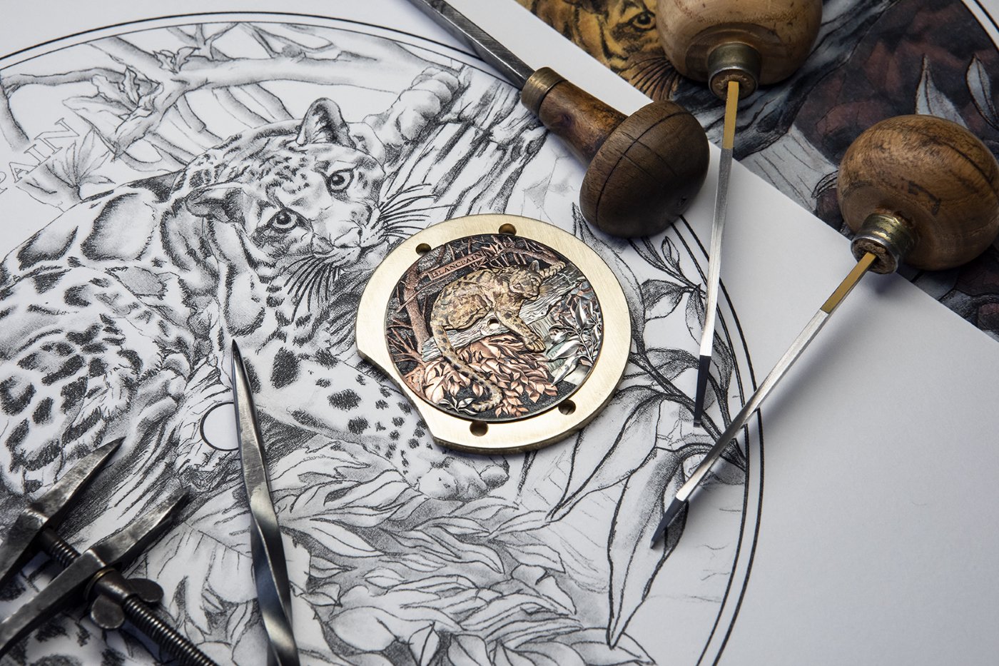 Each particular design represents a special and one-unit piece, since no two designs will be the same. The dial featuring the Formosa clouded leopard is a perfect example. The work on creating such a timepiece begins with a paper sketch of the pose and the background decorations. The image of the leopard, along with other foreground elements, takes the form of a gold applique hand-engraved thanks to extremely precise tools. These appliques are also dipped in different salt baths to obtain the desired color effects, like the spots that adorn the feline’s fur. They are applied to the surface of the dial and held in place by very fine pins, which are inserted into holes preliminary drilled into the dial. The back of the pins are thereafter carefully hammered to ensure that they will remain securely nestled in place.