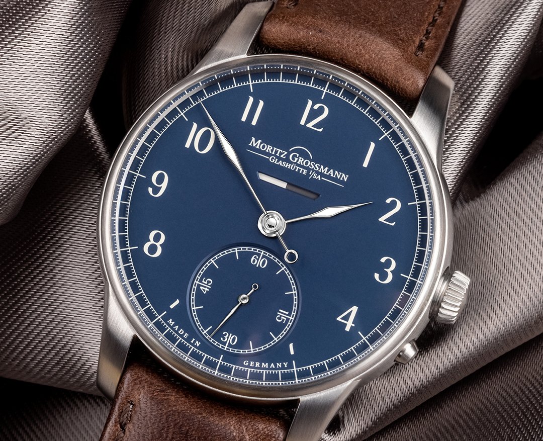Crafted from stainless steel, the polished hands feature a white HyCeram filling and subtly contrast with the blue of the dial. HyCeram is a composite material with a UV-stable colour and forms a firm bond with the metal base. The coloured filling can be sanded and polished flush with the hands. This lends a special brilliance to Grossman’s characteristically fine hands to assure excellent legibility.